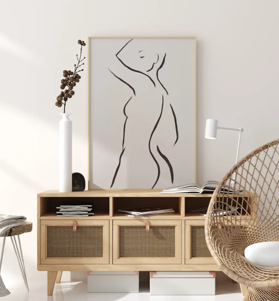 Une affiche de dessin au trait d'une femme qui se grandit. De simples coups de pinceau créent la forme fluide de la tête et du torse de cette femme paisible mais forte à la fois. Regardant vers le bas, elle lève haut son bras gauche. Associez-la à un mur clair pour faire ressortir ses lignes.
