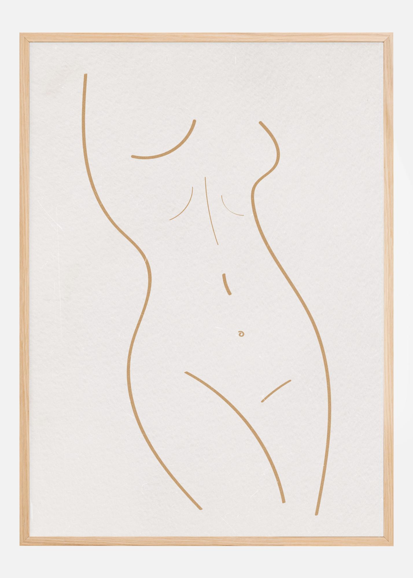 Un dessin d'une femme aux lignes brunes. Des lignes brunes fortes et audacieuses dessinent les jambes, le ventre et la poitrine de la femme. Les lignes sont lisses, s'écoulant vers le haut dans cette élégante affiche en mouvement. Accrochez-la sur un mur blanc pour donner l'impression d'être dans une galerie.