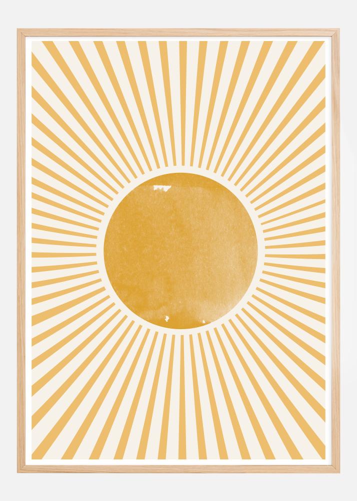 Ce poster vif évoque la sensation d'un soleil radieux avec ses lignes dorées rayonnantes entourant un cercle jaune central sur un fond blanc doux. Le design est inspiré par des motifs bohèmes et géométriques, qui ensemble créent une image de la chaleur et de l'énergie du soleil. Les couleurs chaudes et le motif rayonnant sont conçus pour apporter une sensation de joie et de positivité.