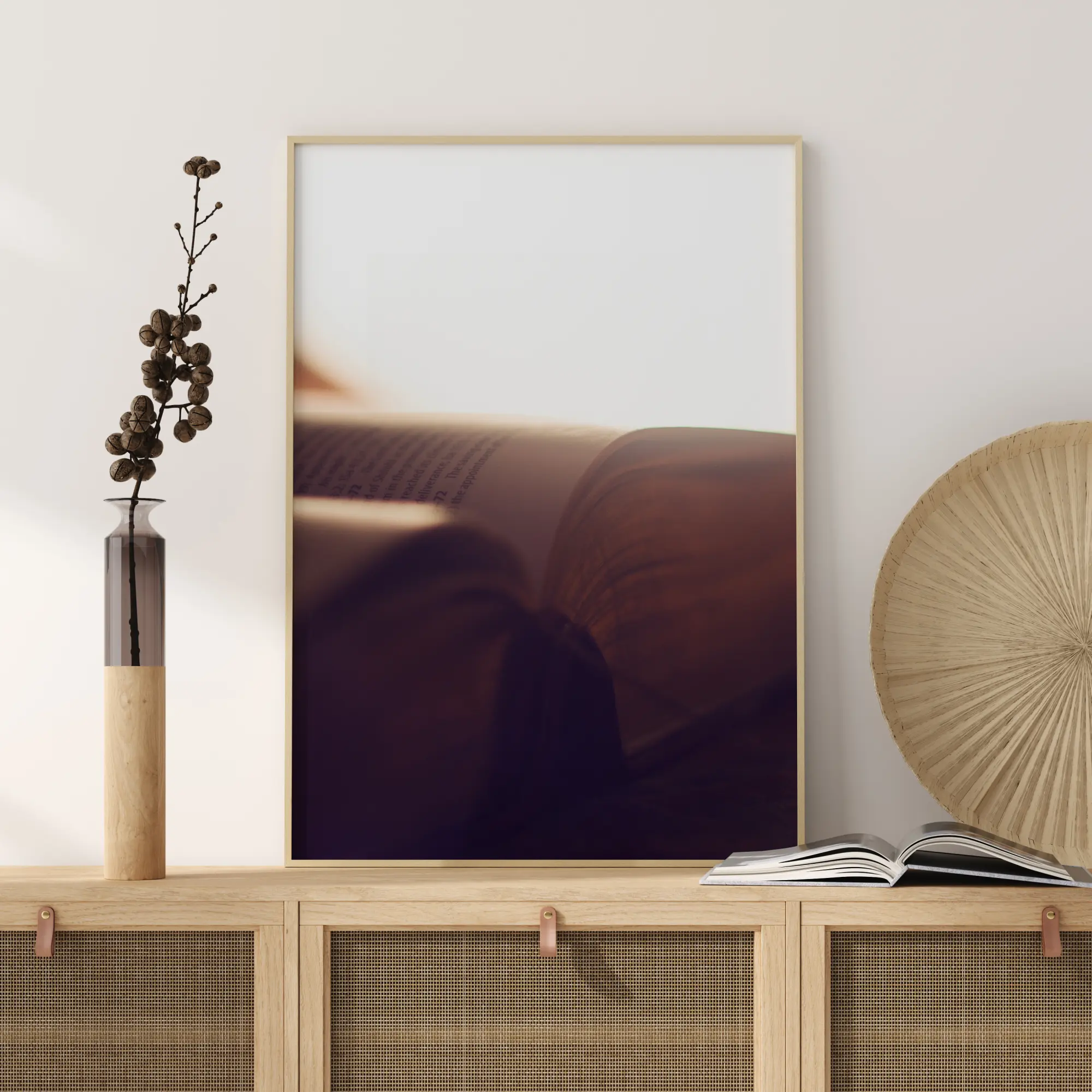 Une affiche en gros plan du côté d'un livre. Une lumière blanche intense remplit la majeure partie de l'image, car elle éclaire le livre en illuminant les bords dorés des pages. Le livre est ouvert et les mots sont visibles sur la page. C'est l'image parfaite pour une salle d'étude.