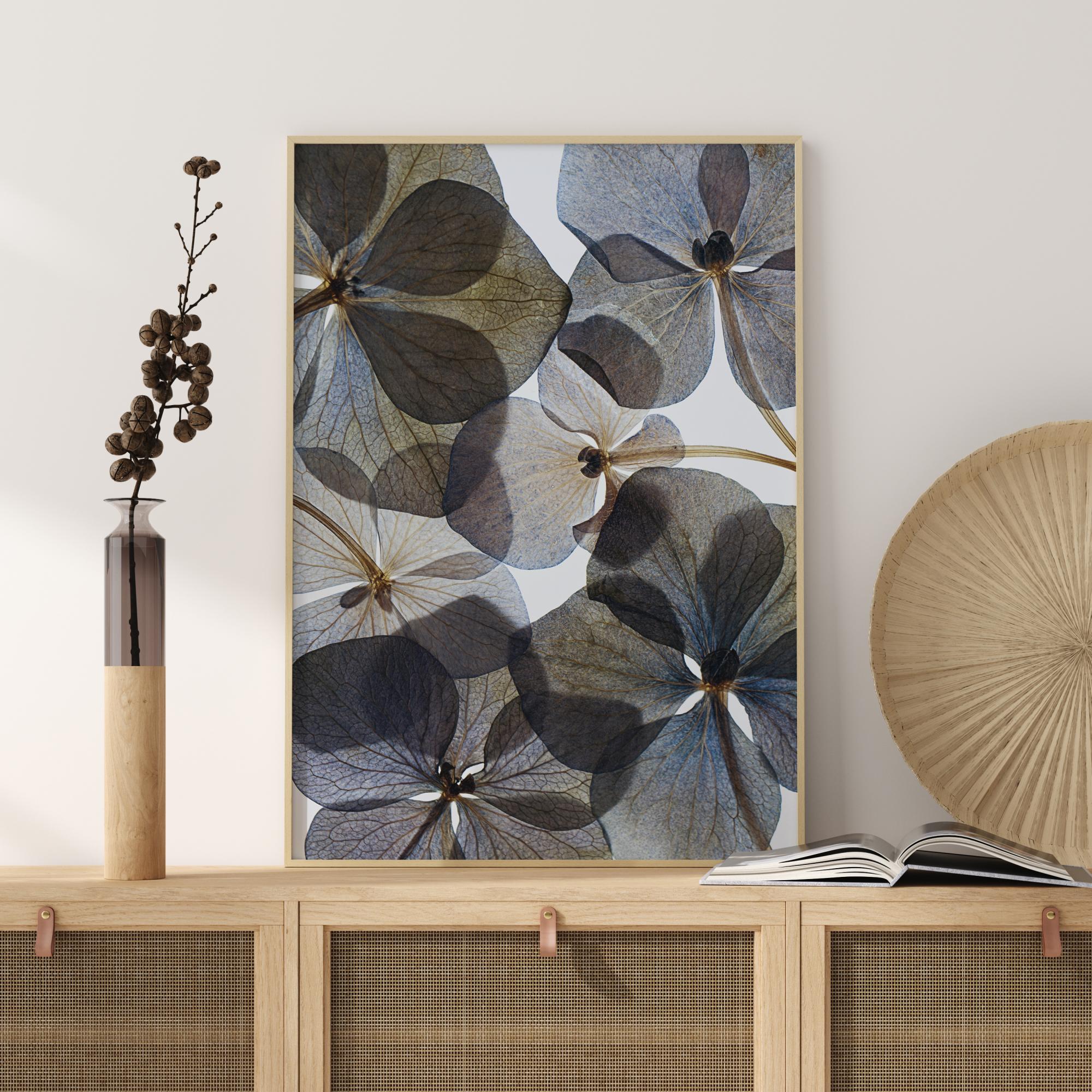 Une affiche botanique remplie de fleurs bleues et brunes transparentes. La lumière blanche de l'arrière-plan transparaît à travers ces pétales, dont certains se chevauchent de sorte qu'ils sont plus foncés que d'autres. Accrochez cette affiche et imaginez que vous êtes sous ces pétales larges et étonnants. Ambiance tranquille assurée.