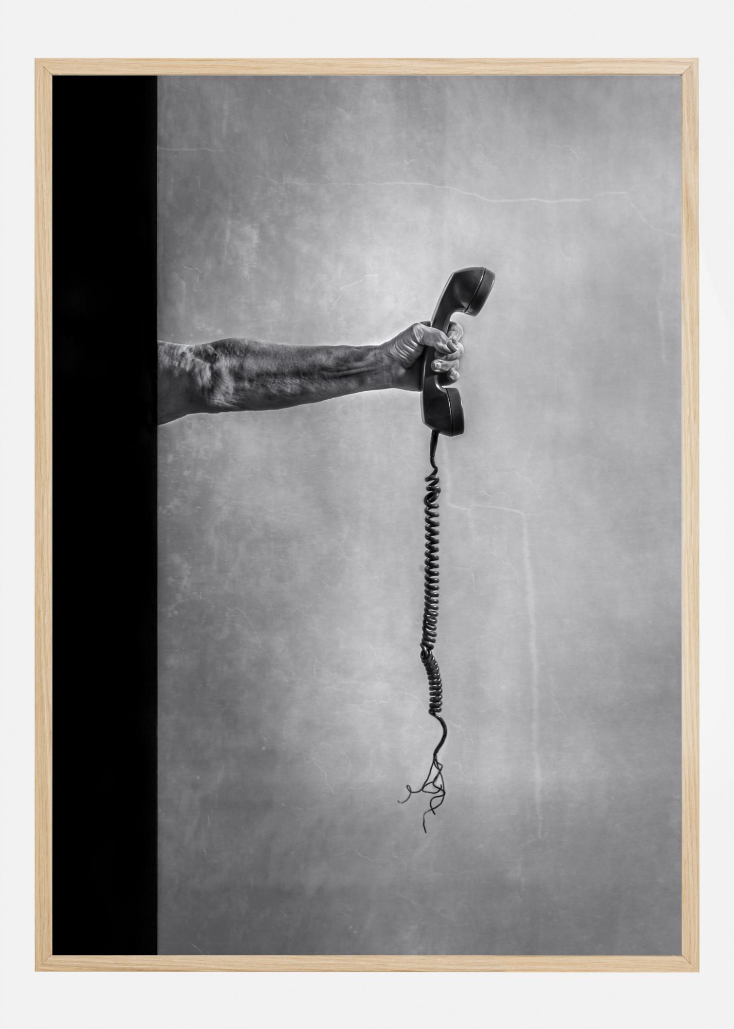 Une affiche en noir et blanc d'un bras tenant un récepteur de téléphone avec un cordon coupé. Le bras, fort, tient le téléphone au milieu de l'affiche. Le téléphone noir et le cordon sont suspendus sur un fond gris. Qui tient le téléphone ? Détendez-vous et contemplez cette image dans votre maison.