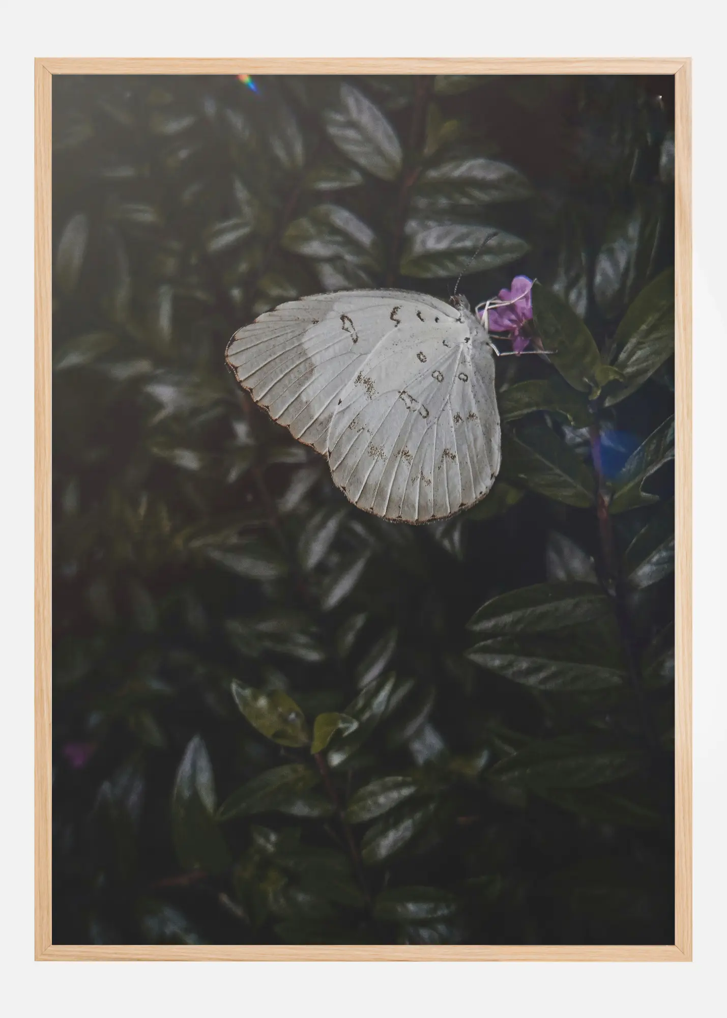 Découvrez la beauté silencieuse de la nature à travers cette affiche évocatrice représentant un papillon délicat au repos. Elle est élégamment placée sur un fond luxuriant de feuilles vert foncé, et ses ailes blanc pâle avec des motifs subtils de gris et de noir mettent en valeur sa fragilité et sa grâce. Cette image est un rappel paisible des moments fugaces et enchanteurs de la nature.