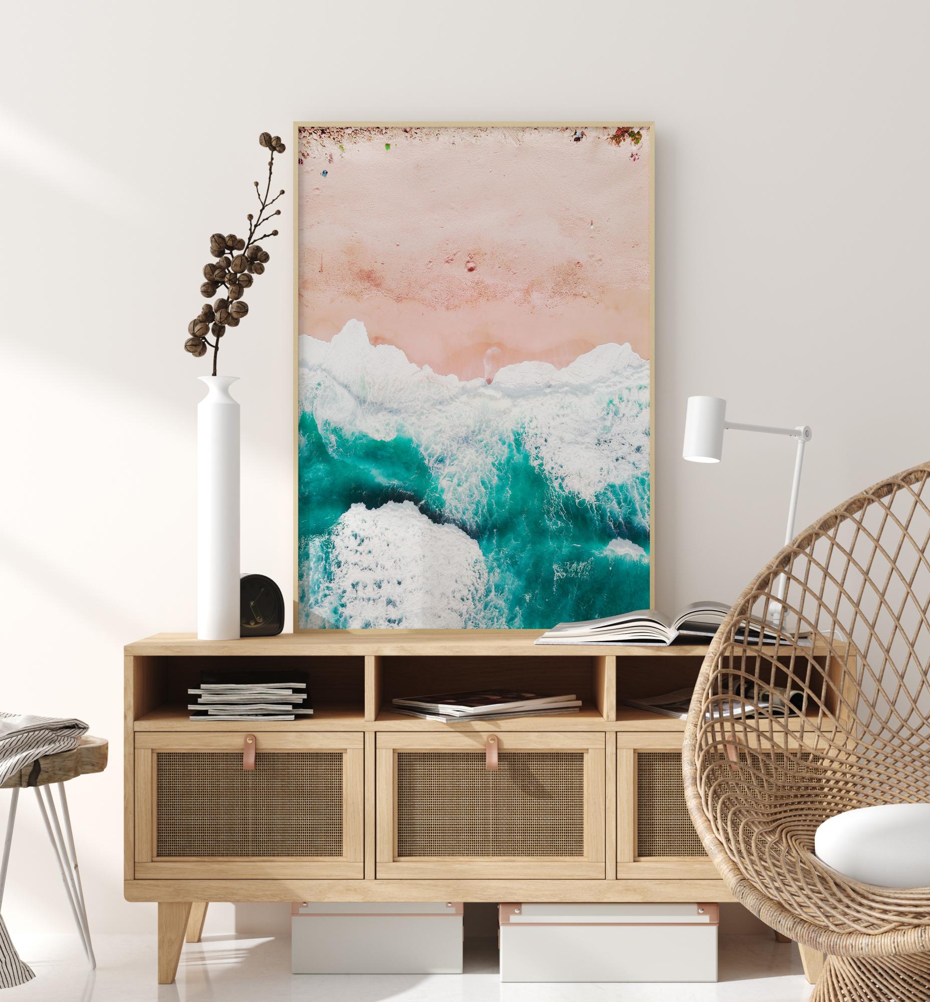 Cette affiche représente une vue aérienne des vagues d'un bleu éclatant atteignant la plage de sable. Les vagues écumeuses se détachent sur le rose pastel de la plage. Quelques taches de couleur supplémentaires montrent les personnes assises sur le rivage. Ces couleurs sont parfaites pour la décoration de votre salle de bains.