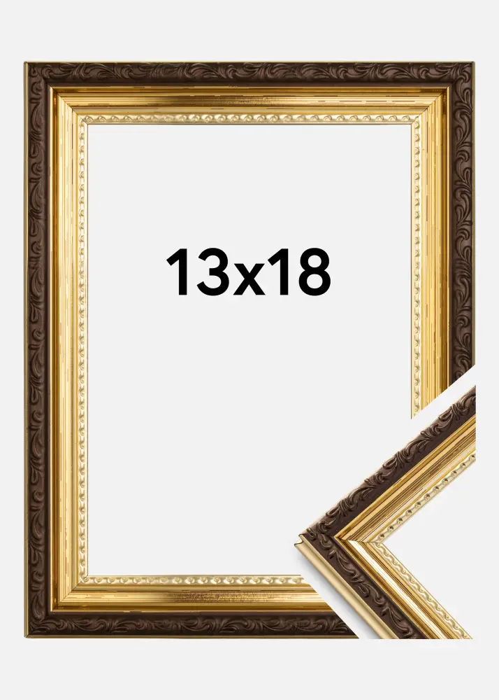 Seriez-vous à la recherche d'un joli cadre décoré dans un style ancien ? Abisko Verre Acrylique Or est un véritable cadre doré avec une ornementation incroyablement esthétique. Les baguettes du cadre d'une largeur de 25 mm sont dans une couleur dorée mate avec une bordure marron ornée au centre. La partie dorée est également décorée, avec un motif ondulé autour du verre.