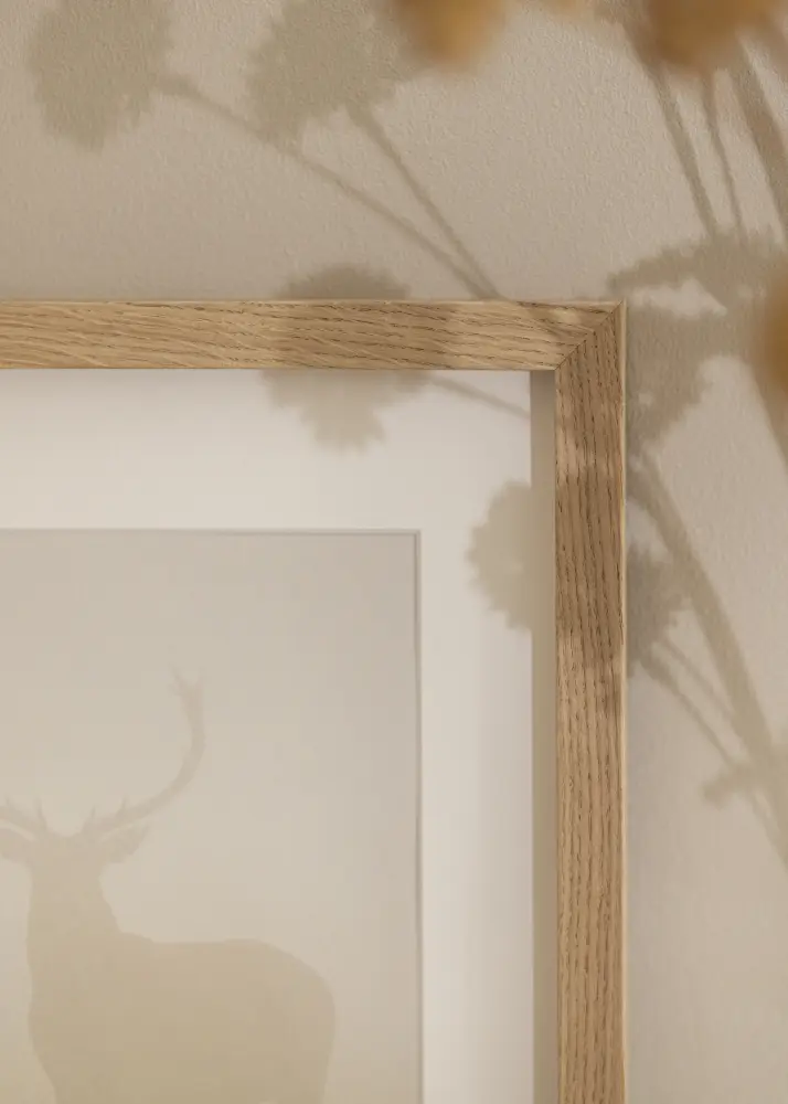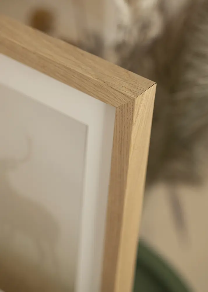 Une caractéristique unique de l'Amanda Box Chêne est la baguette de distance incluse. Cette baguette crée un espace entre le verre et l'image, ce qui donne un effet de profondeur et permet de placer l'image plus loin dans le cadre ou de manière flottante entre le verre et le fond. Cela offre un encadrement épuré et exclusif qui met vraiment en valeur votre motif.