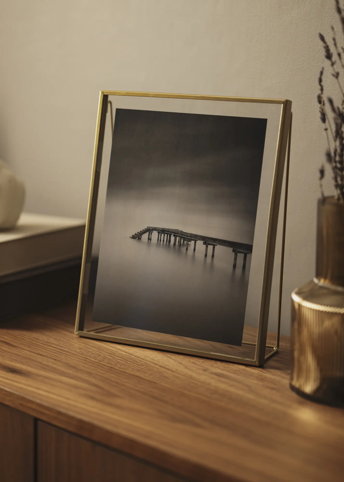 Le cadre photo est équipé d'un support élégant qui donne une impression flottante, ce qui fait que l'image est vraiment mise en avant. Le design ouvert et aéré convient parfaitement sur un bureau, des étagères ou une table d'appoint et donne une expression légère et moderne. Ce cadre est particulièrement beau pour des photos en noir et blanc ou des œuvres d'art qui bénéficient de l'environnement épuré.