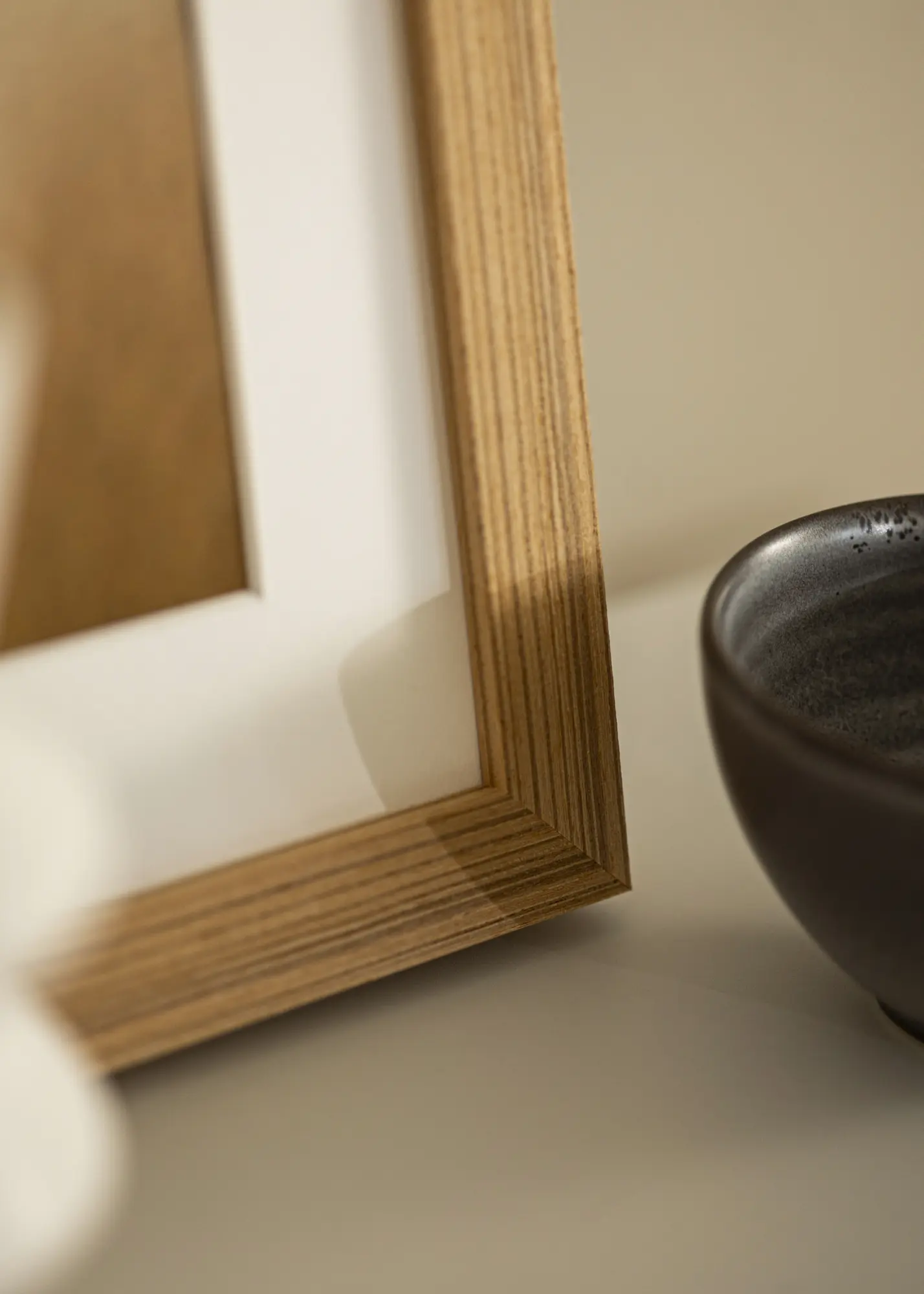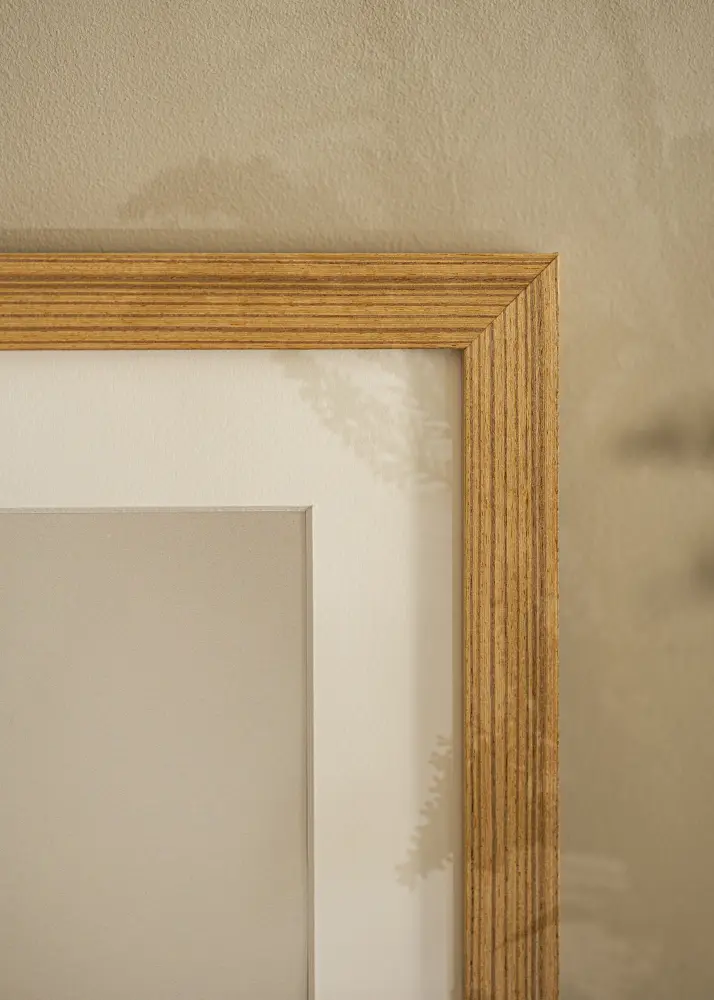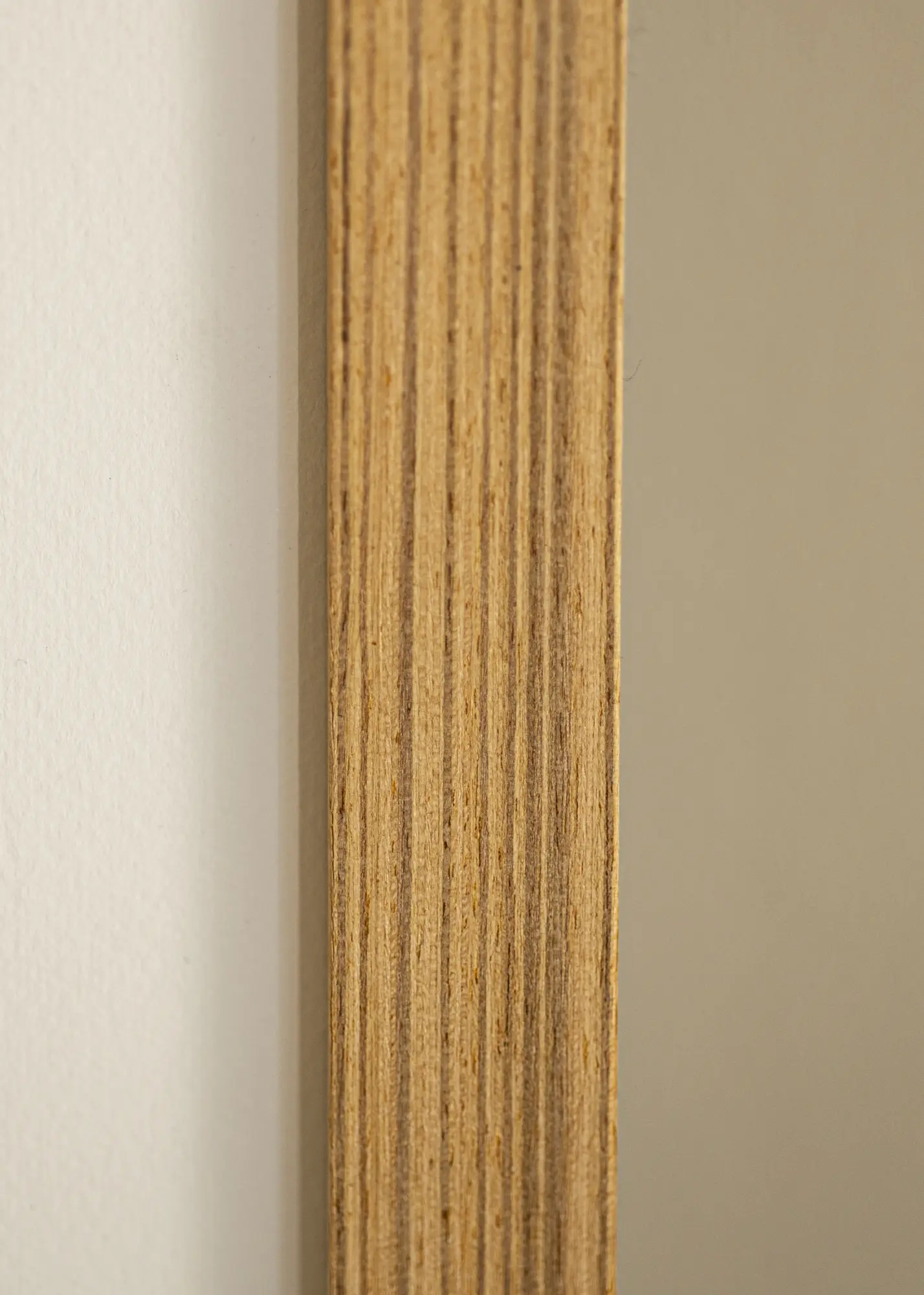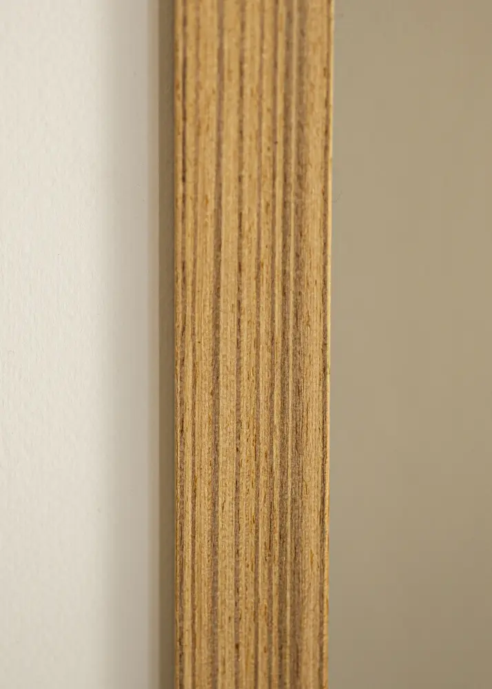 La baguette de cadre de 28 mm de large et une profondeur de 33 mm donnent au cadre une sensation robuste et stable. Les veines verticales claires renforcent la sensation de bois et créent une structure vive. La finition mate met en valeur les variations naturelles du chêne sans donner d'effets réfléchissants, ce qui le rend idéal pour afficher vos photos préférées sans distractions.