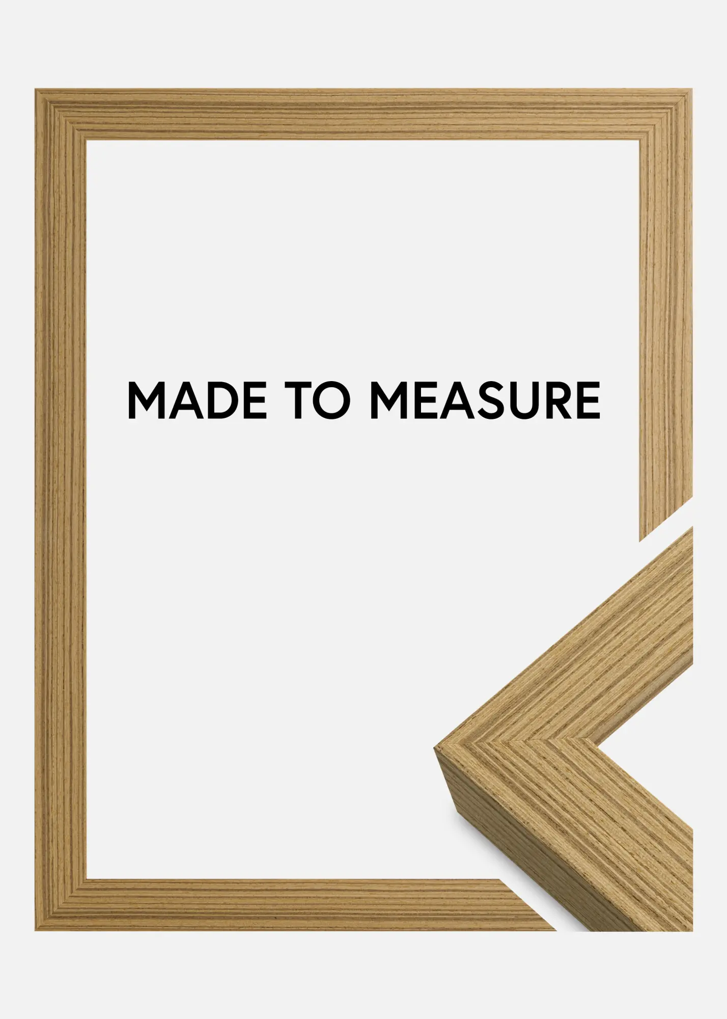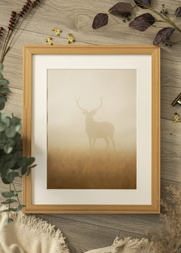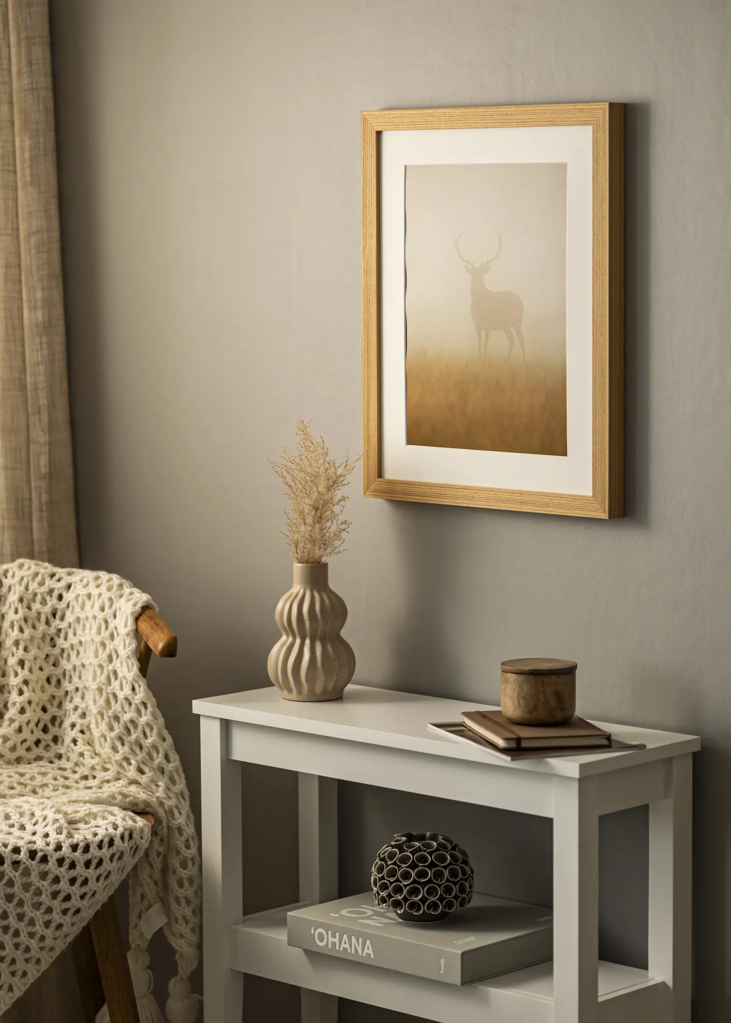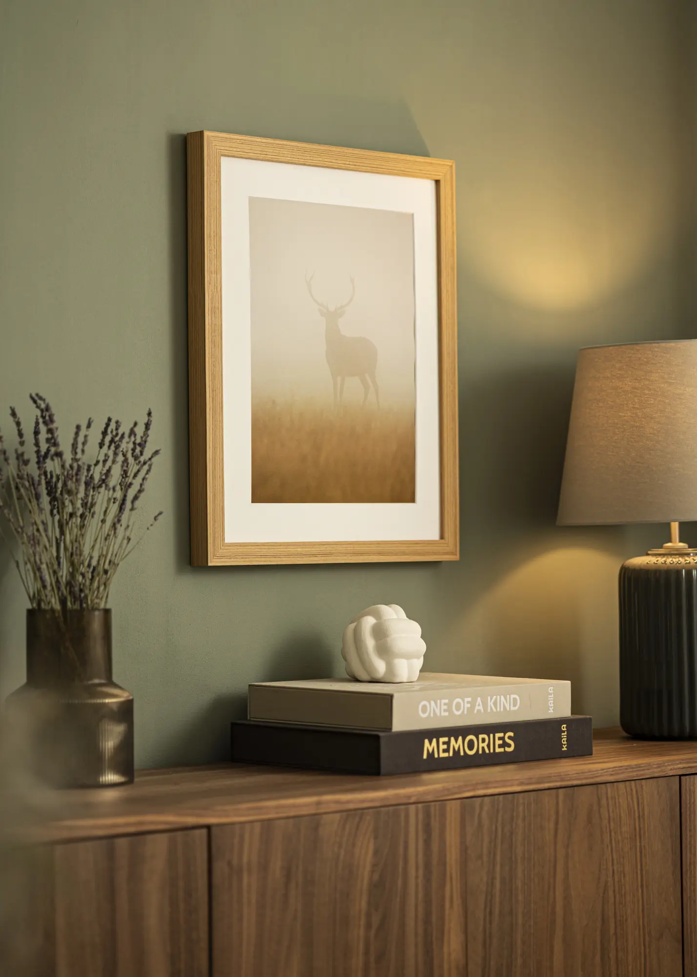 La baguette de cadre de 28 mm de large et une profondeur de 33 mm donnent au cadre une sensation robuste et stable. Les veines verticales claires renforcent la sensation de bois et créent une structure vive. La finition mate met en valeur les variations naturelles du chêne sans donner d'effets réfléchissants, ce qui le rend idéal pour afficher vos photos préférées sans distractions.