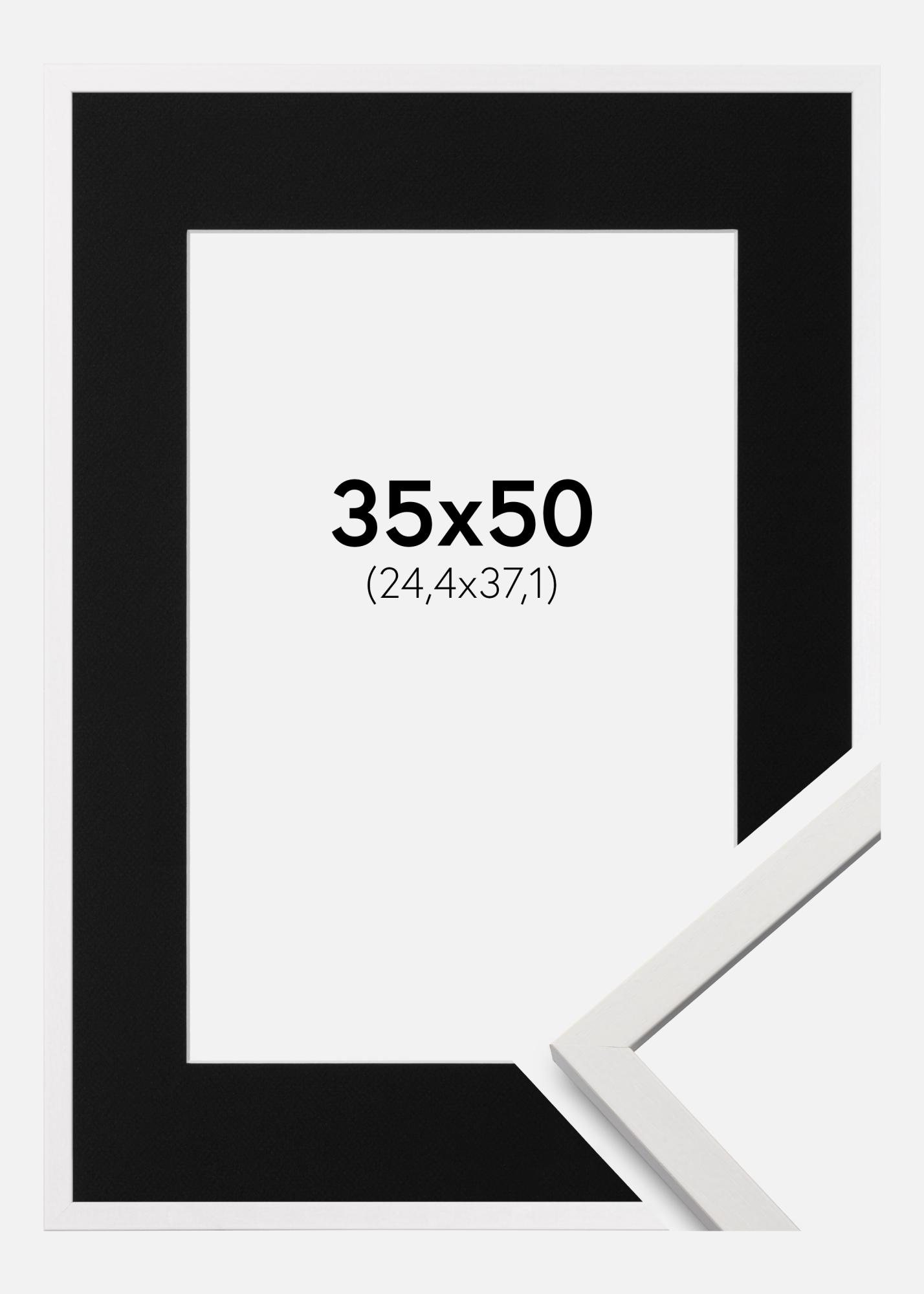 Forfait comprenant un cadre photo et un passe-partout noir inclus. Sur l'image du produit vous pouvez voir les dimensions du cadre (indiquées en gras) et les dimensions intérieures du passe-partout (indiquées entre parenthèses). Veuillez noter que les dimensions intérieures du passe-partout doivent toujours être inférieures de 1 cm à la taille de l'image souhaitée.