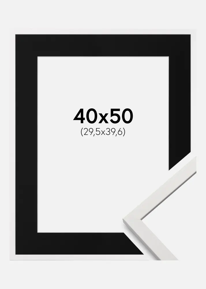 Forfait comprenant un cadre photo et un passe-partout noir inclus. Sur l'image du produit vous pouvez voir les dimensions du cadre (indiquées en gras) et les dimensions intérieures du passe-partout (indiquées entre parenthèses). Veuillez noter que les dimensions intérieures du passe-partout doivent toujours être inférieures de 1 cm à la taille de l'image souhaitée.