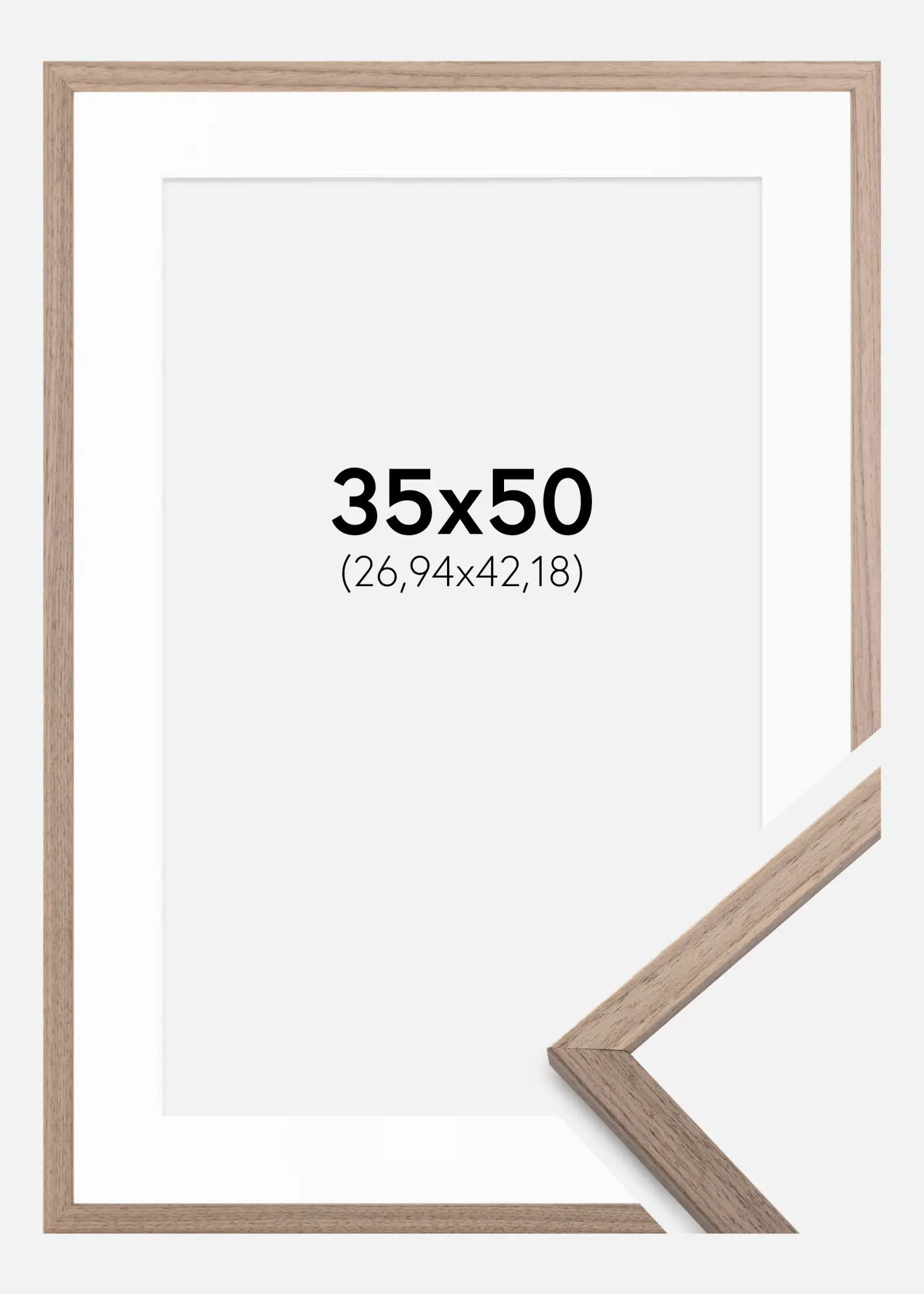 Forfait comprenant le cadre photo et le passe-partout blanc assorti. Sur la photo du produit, vous pouvez voir les dimensions du cadre (indiquées en gras) et les dimensions intérieures du passe-partout (indiquées entre parenthèses). Notez que les dimensions intérieures du passe-partout se doivent d'être toujours 1 cm inférieures par rapport à la taille de l'image que vous souhaitez encadrer.