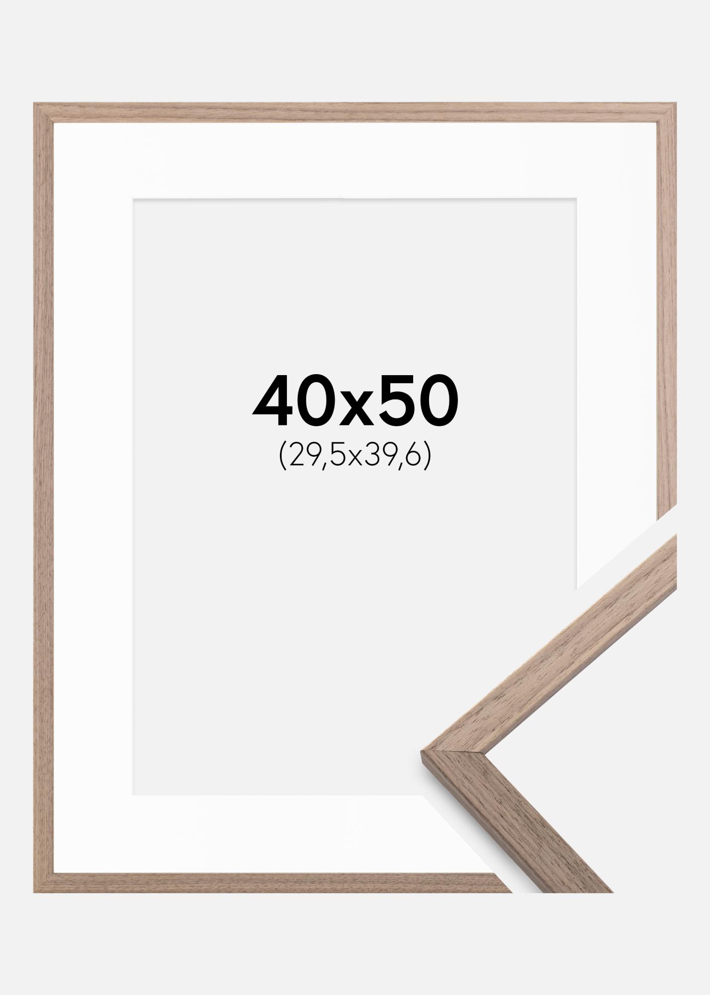 Forfait comprenant le cadre photo et le passe-partout blanc assorti. Sur la photo du produit, vous pouvez voir les dimensions du cadre (indiquées en gras) et les dimensions intérieures du passe-partout (indiquées entre parenthèses). Notez que les dimensions intérieures du passe-partout se doivent d'être toujours 1 cm inférieures par rapport à la taille de l'image que vous souhaitez encadrer.