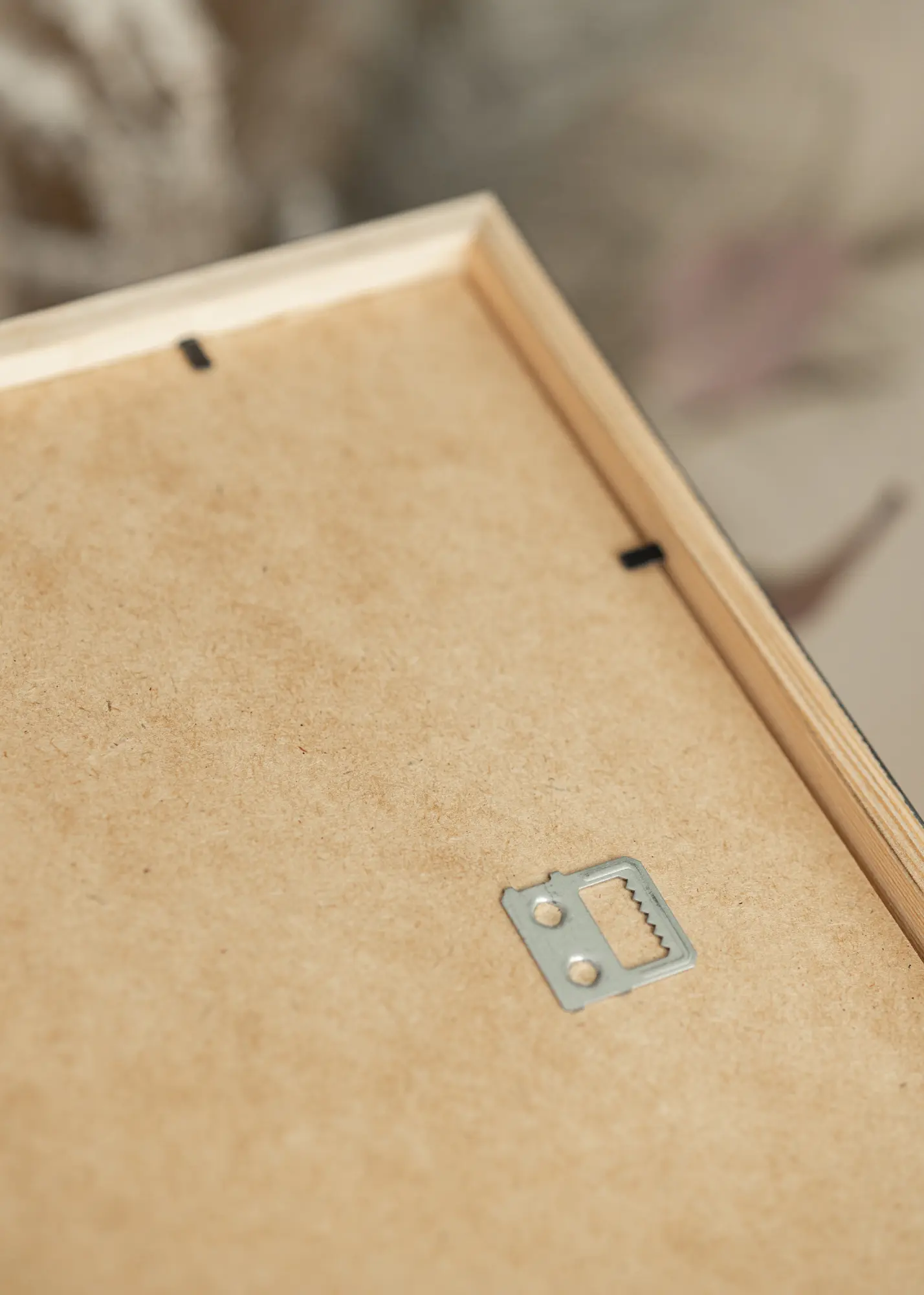 Le cadre peut être accroché au mur en position portrait et paysage, et il s'adapte aussi bien seul au mur qu'en combinaison avec d'autres cadres. Au dos se trouve une plaque de fond en HDF, qui est maintenue en place par de petites broches. Pour insérer vos motifs, dépliez les broches et retirez le fond.