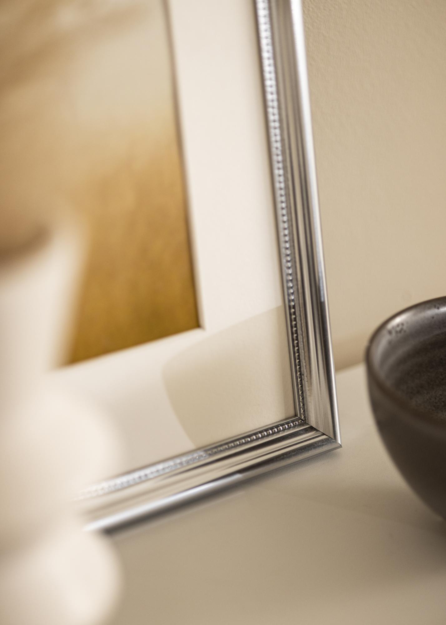 Ce cadre élégant en argent avec une surface brillante offre à vos images un encadrement sophistiqué. Avec une largeur de 20 mm et une profondeur de 17 mm, il est à la fois élégant et robuste. Le cadre est équipé de crochets en métal à l'arrière, ce qui facilite son accrochage aussi bien horizontalement que verticalement.