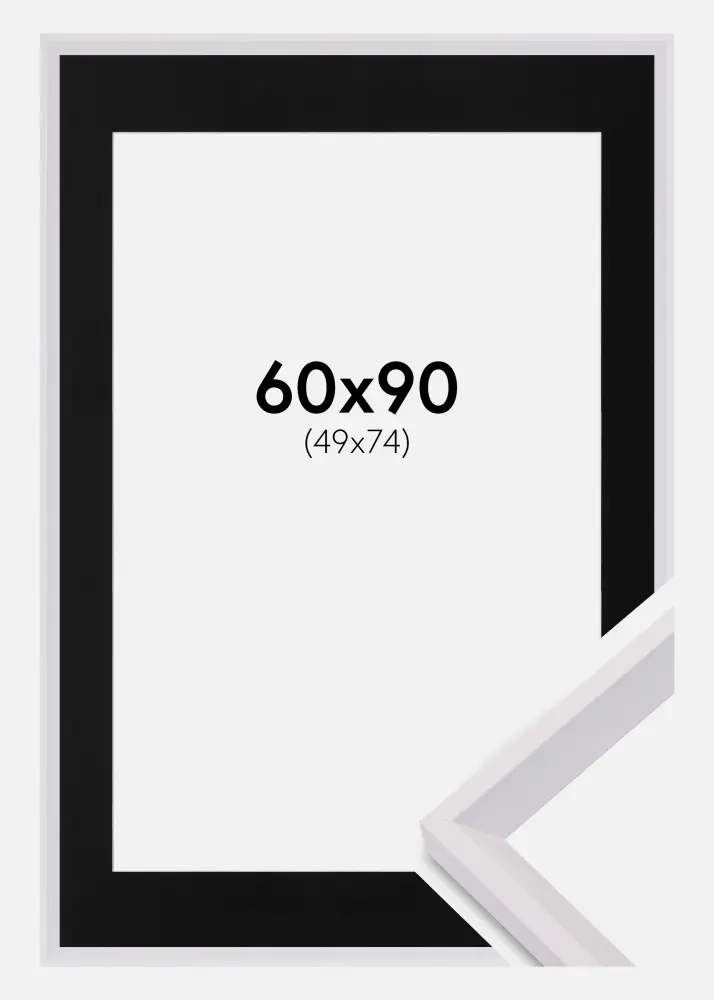 Forfait comprenant un cadre photo et un passe-partout noir inclus. Sur l'image du produit vous pouvez voir les dimensions du cadre (indiquées en gras) et les dimensions intérieures du passe-partout (indiquées entre parenthèses). Veuillez noter que les dimensions intérieures du passe-partout doivent toujours être inférieures de 1 cm à la taille de l'image souhaitée.