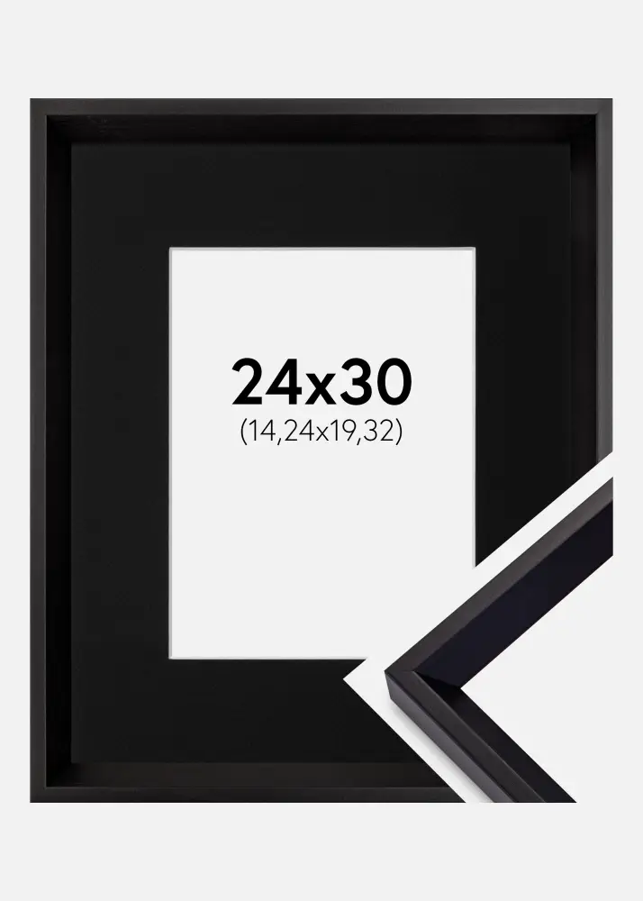 Forfait comprenant un cadre photo et un passe-partout noir inclus. Sur l'image du produit vous pouvez voir les dimensions du cadre (indiquées en gras) et les dimensions intérieures du passe-partout (indiquées entre parenthèses). Veuillez noter que les dimensions intérieures du passe-partout doivent toujours être inférieures de 1 cm à la taille de l'image souhaitée.