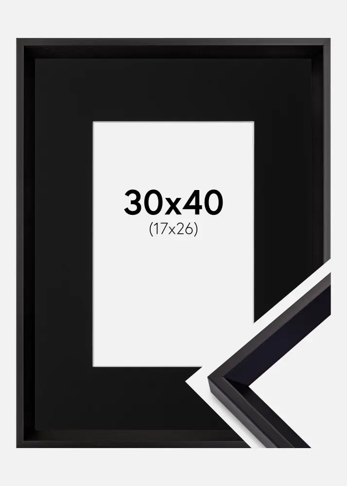 Forfait comprenant un cadre photo et un passe-partout noir inclus. Sur l'image du produit vous pouvez voir les dimensions du cadre (indiquées en gras) et les dimensions intérieures du passe-partout (indiquées entre parenthèses). Veuillez noter que les dimensions intérieures du passe-partout doivent toujours être inférieures de 1 cm à la taille de l'image souhaitée.