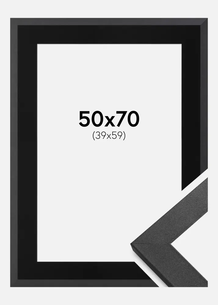 Forfait comprenant un cadre photo et un passe-partout noir inclus. Sur l'image du produit vous pouvez voir les dimensions du cadre (indiquées en gras) et les dimensions intérieures du passe-partout (indiquées entre parenthèses). Veuillez noter que les dimensions intérieures du passe-partout doivent toujours être inférieures de 1 cm à la taille de l'image souhaitée.