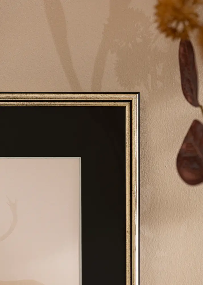 Forfait comprenant un cadre photo et un passe-partout noir inclus. Sur l'image du produit vous pouvez voir les dimensions du cadre (indiquées en gras) et les dimensions intérieures du passe-partout (indiquées entre parenthèses). Veuillez noter que les dimensions intérieures du passe-partout doivent toujours être inférieures de 1 cm à la taille de l'image souhaitée.