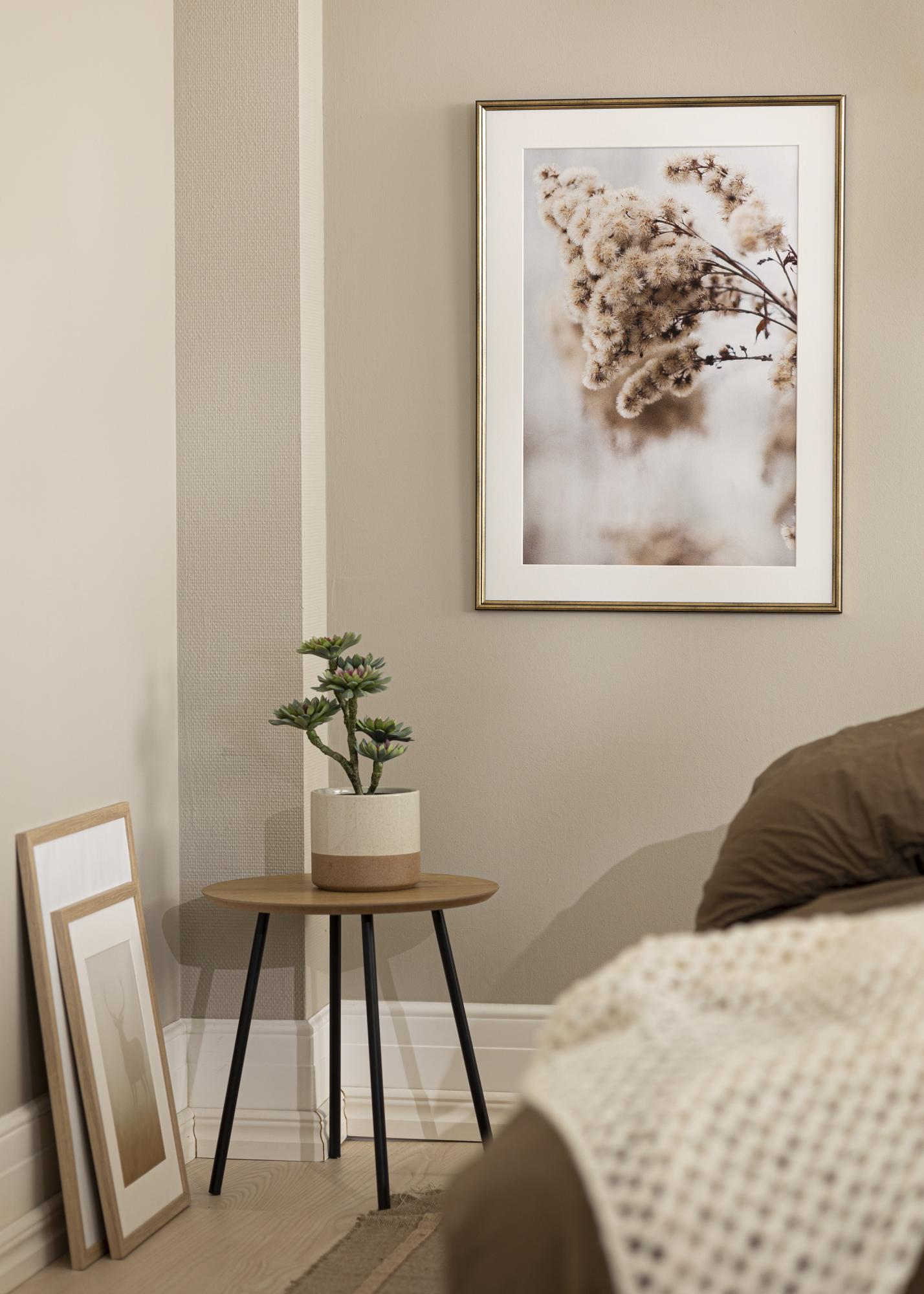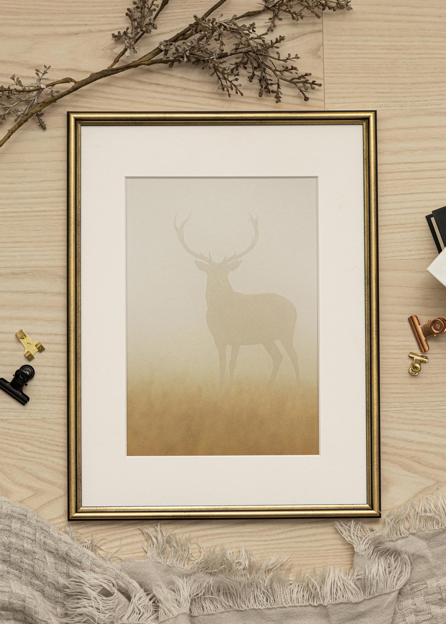 Offrez à vos images favorites un cadre luxueux d'inspiration rétro qui apportera une touche de fantaisie dans votre maison. Horndal est un cadre de conception suédoise de couleur dorée tachetée de noir et au fini mat. Le fait qu'il soit moucheté de noir donne à ce cadre une apparence plus discrète, ce qui permet au motif d'être au centre de l'attention. La baguette de cadre est conçue en bois d'ayous peint et à une fine épaisseur tout en élégance de seulement 15 mm .