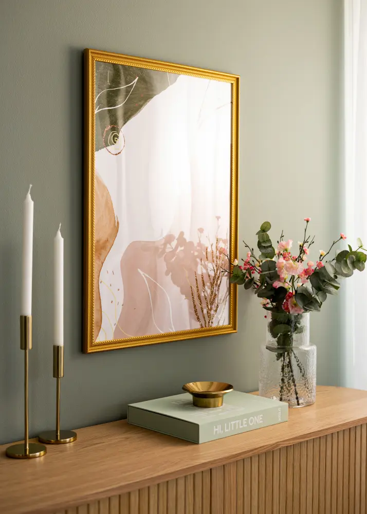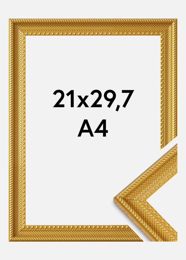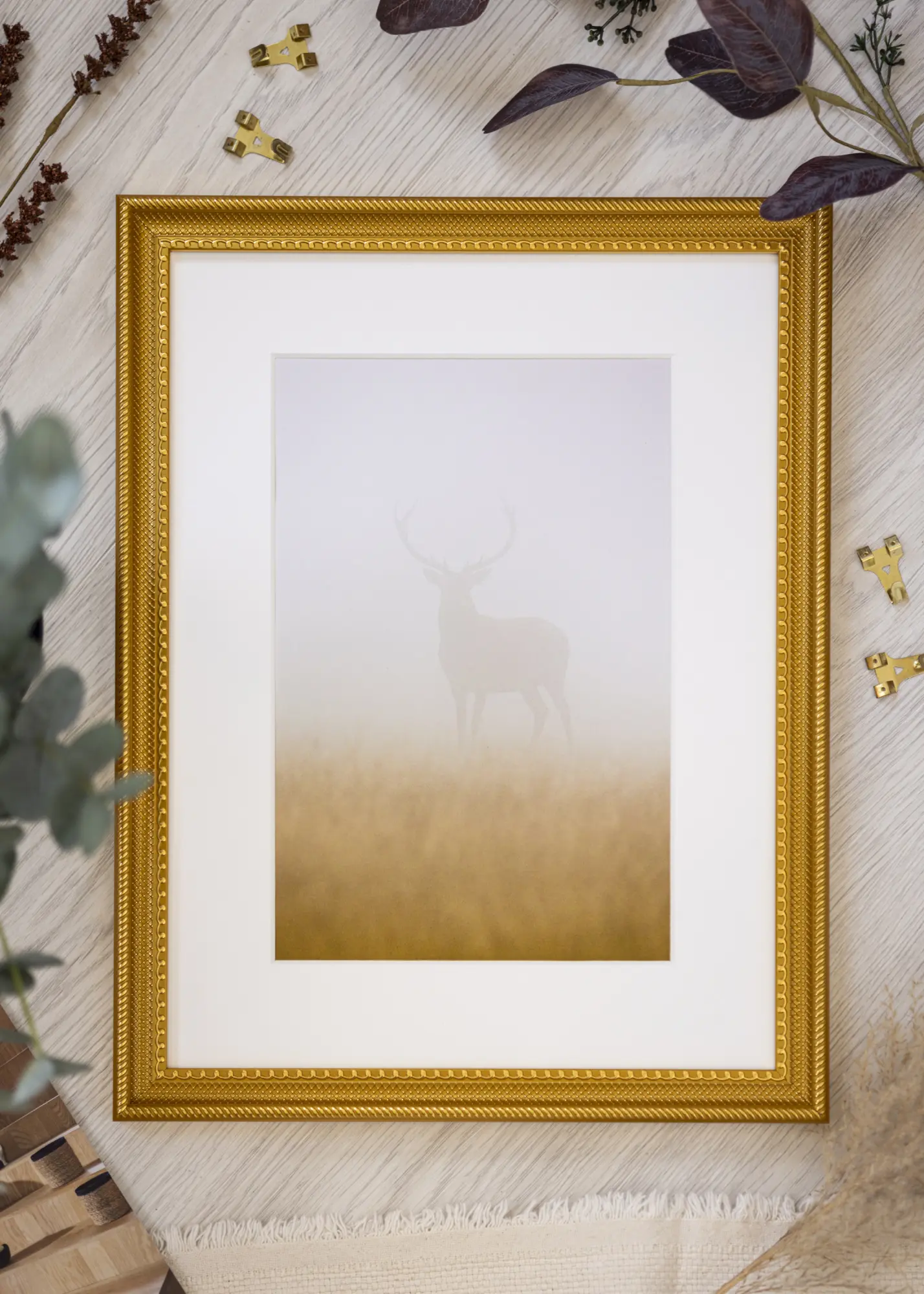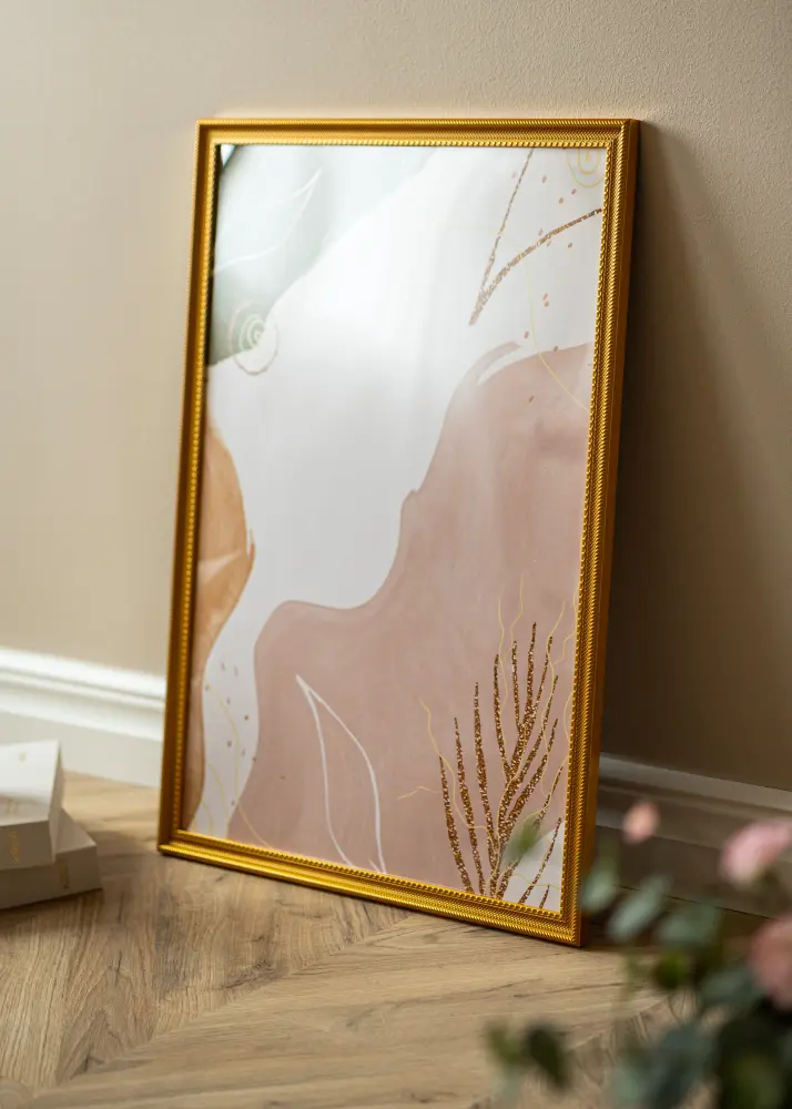Ce cadre photo élégant en or est une combinaison parfaite de design classique et de fonctionnalité moderne. Avec ses motifs détaillés le long des bords et une finition brillante, il procure une sensation de luxe qui rehausse chaque œuvre d'art ou photographie. Le cadre est fabriqué en matériau composite, ce qui lui confère à la fois solidité et légèreté. Il est conçu pour s'adapter à des sujets de taille 21x29,7 cm (A4), ce qui le rend idéal pour afficher vos souvenirs préférés de manière élégante.