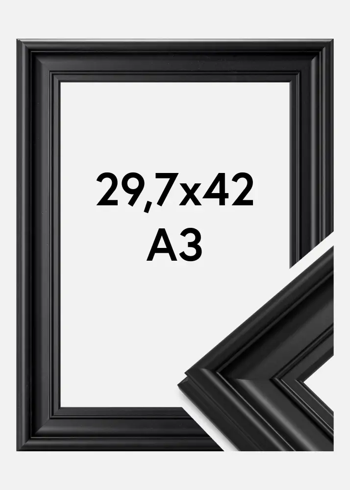 Mora Premium Schwarz ist einer unserer feinsten rahmen. Hergestellt aus Holz aus unseren schönen schwedischen Wäldern und montiert in unserer eigenen Rahmenwerkstatt. Das ermöglicht es uns, eine Qualität über das Übliche hinaus zu versprechen. Der Rahmen hat ein stilvolles breites schwarzes Profil von ganzen 57 mm. Perfekt für Ihre schönsten Bilder!