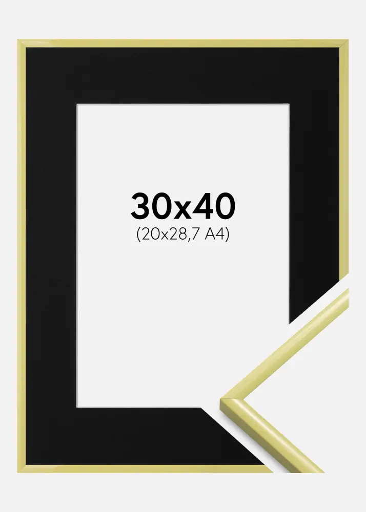Forfait comprenant un cadre photo et un passe-partout noir inclus. Sur l'image du produit vous pouvez voir les dimensions du cadre (indiquées en gras) et les dimensions intérieures du passe-partout (indiquées entre parenthèses). Veuillez noter que les dimensions intérieures du passe-partout doivent toujours être inférieures de 1 cm à la taille de l'image souhaitée.