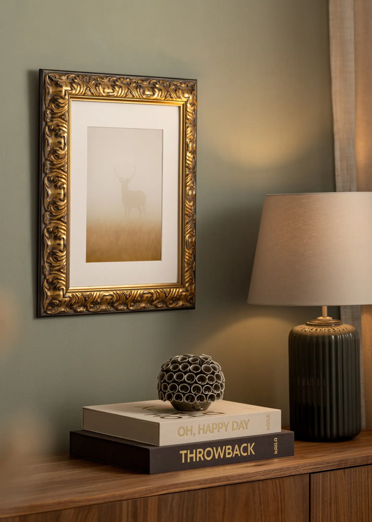 Le cadre présente une belle finition dorée avec des touches subtiles de noir qui créent une sensation antique et sophistiquée. Le design orné offre une apparence classique où le noir ajoute profondeur et contraste à l'or chaud. Cela le rend idéal pour des encadrements traditionnels et élégants, qu'il s'agisse de portraits de famille, d'œuvres d'art ou d'autres images significatives.