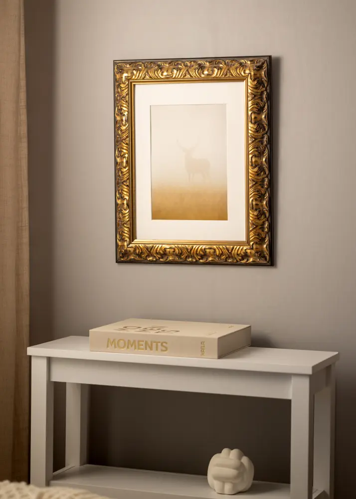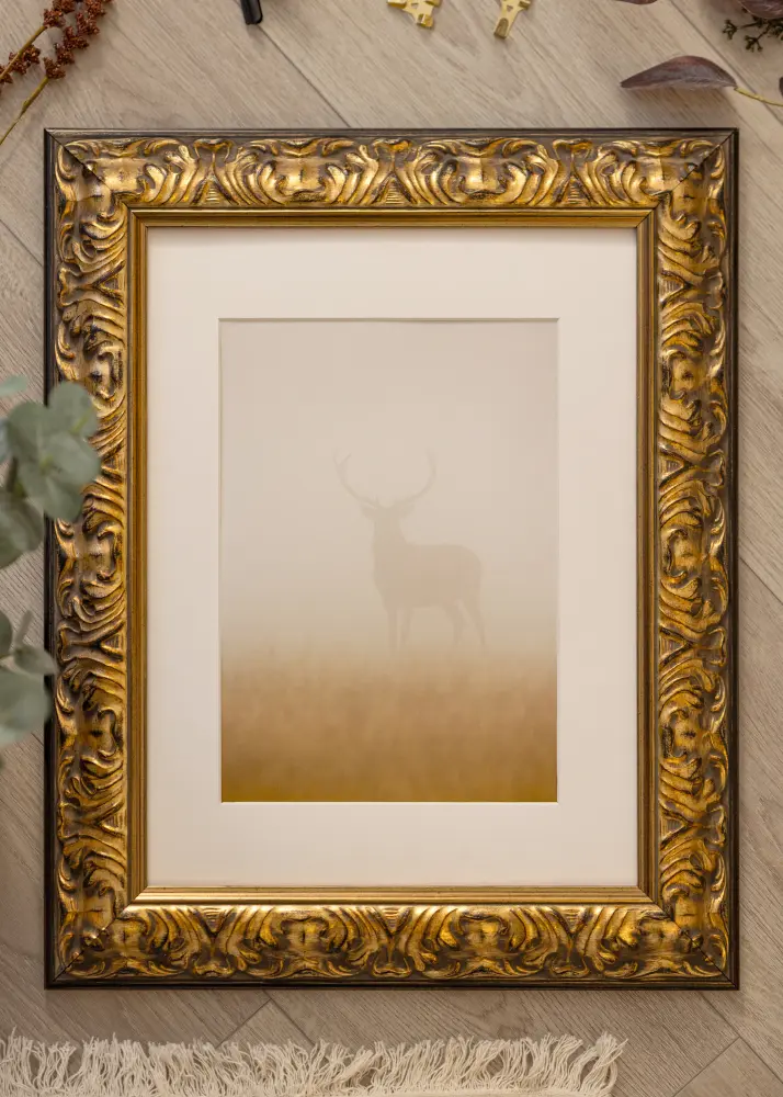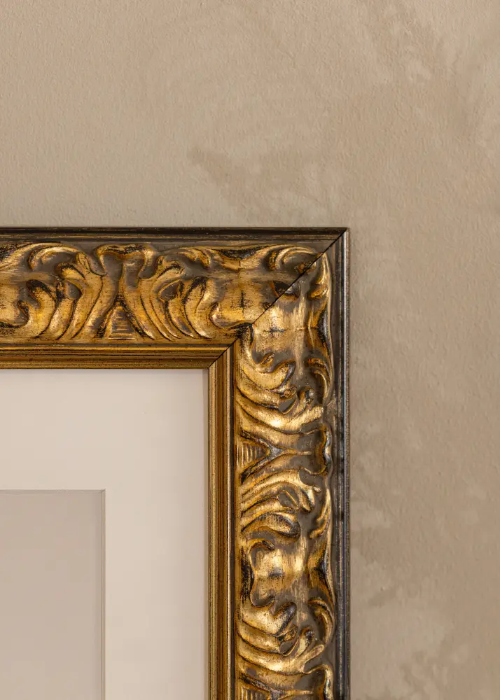 Notre cadre Odin sur mesure en or et noir est le choix parfait pour ceux qui recherchent un encadrement élégant et classique. Avec sa finition dorée et ses touches noires, ce cadre photo offre une sensation antique qui rehausse chaque œuvre d'art ou photographie. Le design ornementé crée un beau contraste entre l'or chaud et les profonds détails noirs, apportant un look élégant et traditionnel.