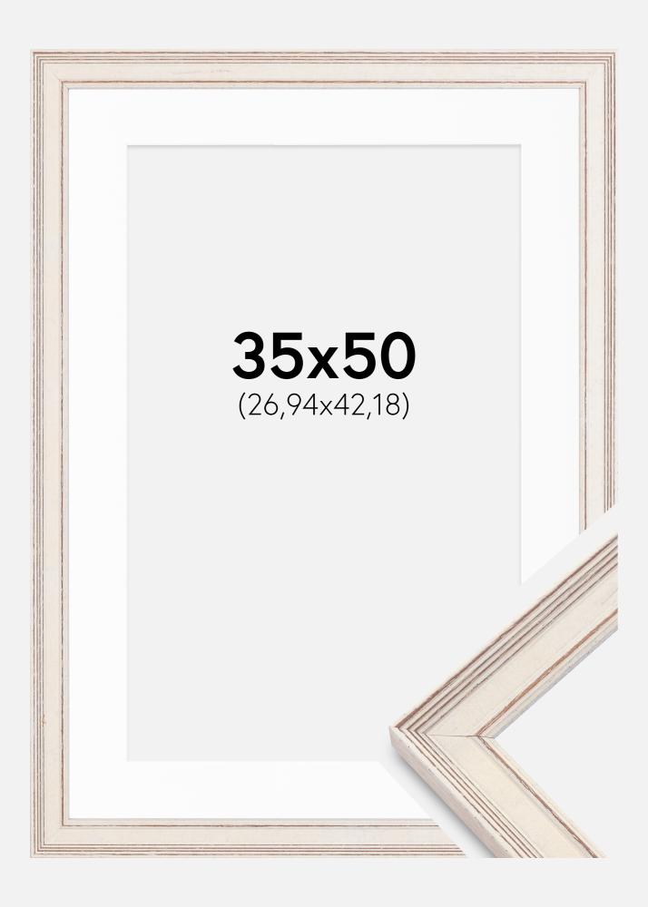 Forfait comprenant le cadre photo et le passe-partout blanc assorti. Sur la photo du produit, vous pouvez voir les dimensions du cadre (indiquées en gras) et les dimensions intérieures du passe-partout (indiquées entre parenthèses). Notez que les dimensions intérieures du passe-partout se doivent d'être toujours 1 cm inférieures par rapport à la taille de l'image que vous souhaitez encadrer.