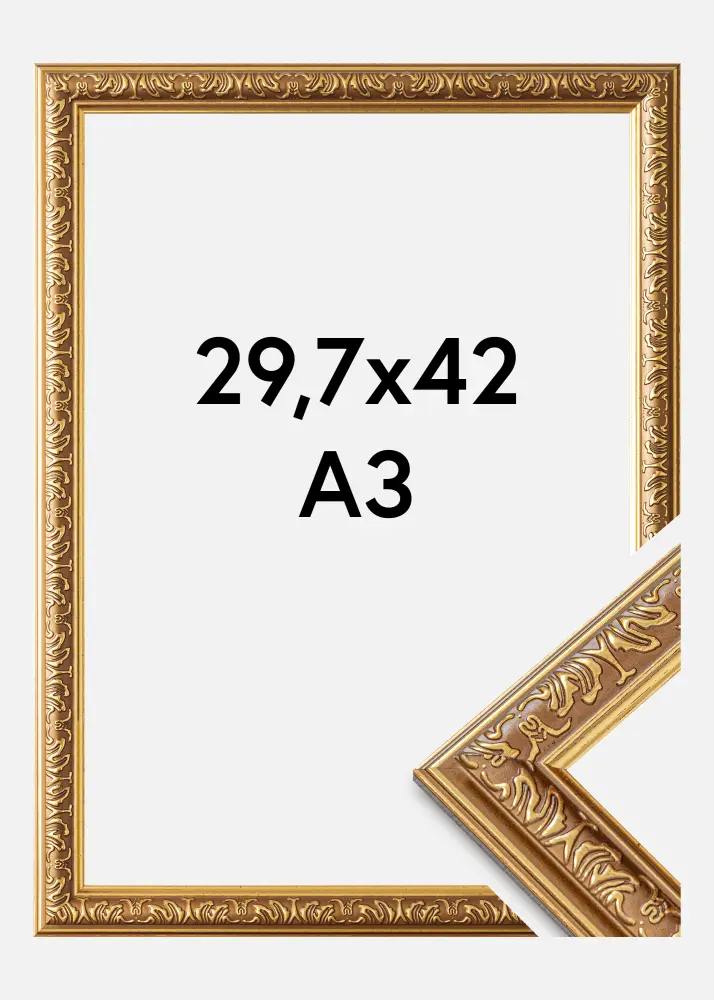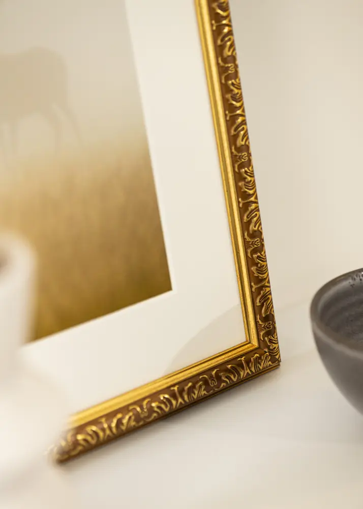 La bande de cadre de 28 mm de large en or a des détails décoratifs et ornementés qui donnent une sensation traditionnelle et intemporelle. Les motifs intriqués le long du bord intérieur renforcent son apparence sophistiquée, ce qui le rend idéal pour les styles d'intérieur classiques et élégants. Avec une profondeur de 20 mm, le cadre offre un encadrement stable et robuste à vos images.
