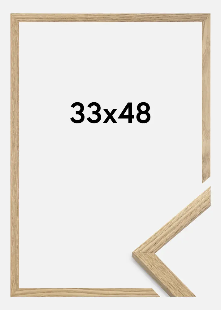 Le cadre, fabriqué en MDF avec placage en aluminium et une surface de couleur chêne est doté d'un mince profil de 15 mm. Il y a suffisamment d'espace pour combiner vos images avec un passe-partout luxueux, grâce à la profondeur intérieure du cadre (profondeur de baguette) de 12 mm.