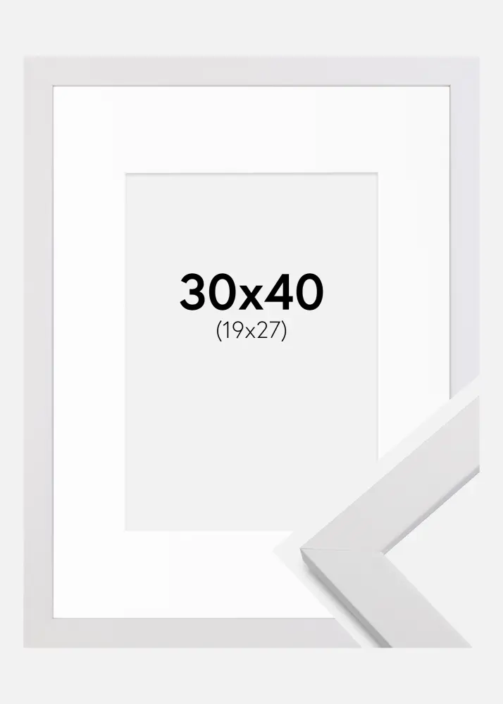 Forfait comprenant le cadre photo et le passe-partout blanc assorti. Sur la photo du produit, vous pouvez voir les dimensions du cadre (indiquées en gras) et les dimensions intérieures du passe-partout (indiquées entre parenthèses). Notez que les dimensions intérieures du passe-partout se doivent d'être toujours 1 cm inférieures par rapport à la taille de l'image que vous souhaitez encadrer.