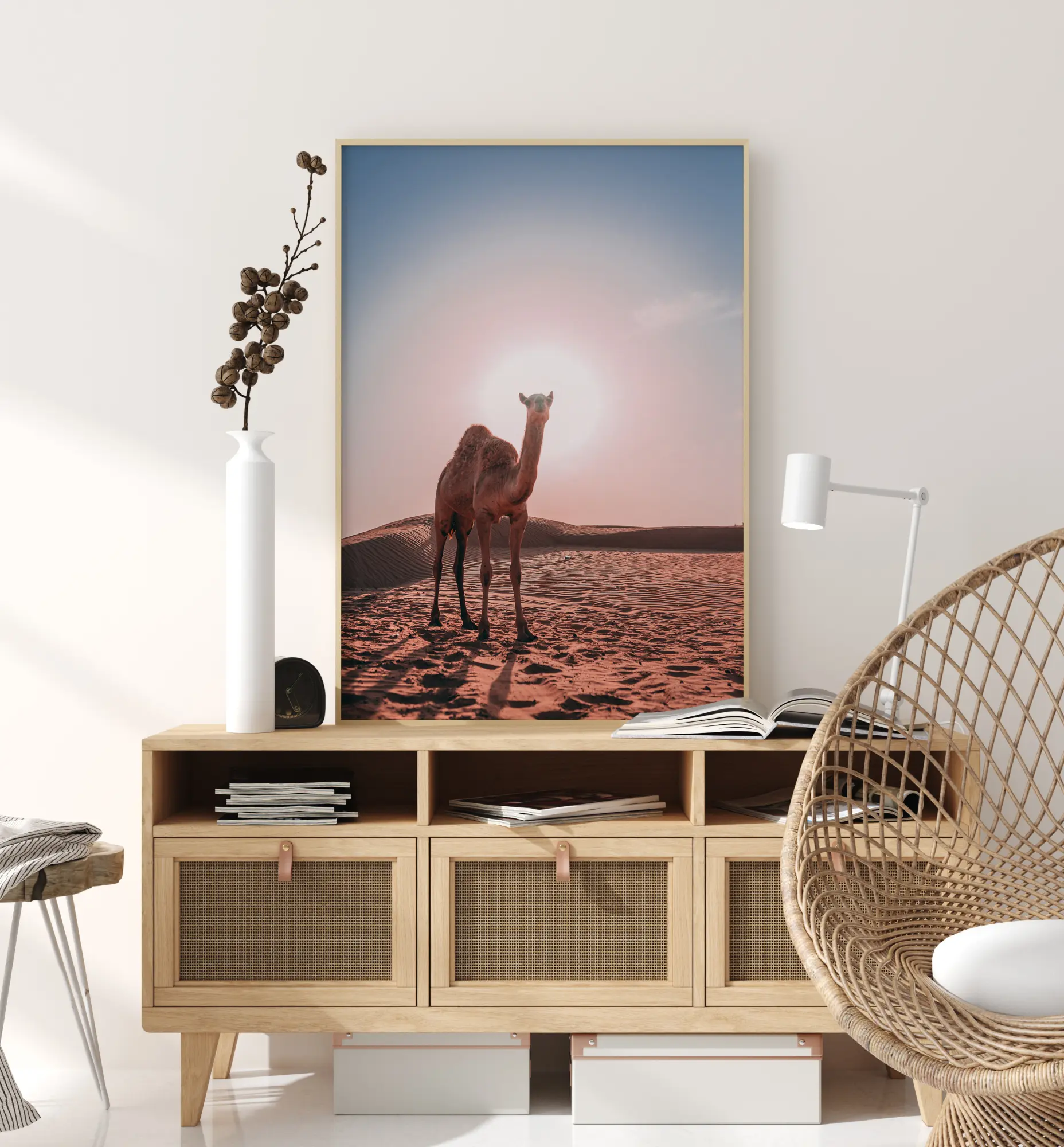 Affiche animalière d'un chameau debout dans le désert. Le chameau est tourné vers l'avant dans le sable doux. Le soleil derrière lui crée un halo spectaculaire derrière sa tête, ce qui le met encore plus en valeur. Le ciel bleu vif contraste avec le sable, pour un portrait de chameau plus unique.
