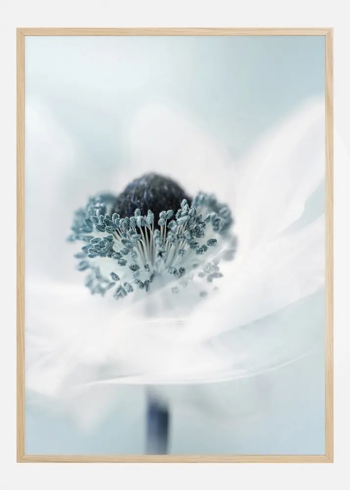 Une affiche en gros plan d'une superbe fleur blanche. Approchez-vous du petit stigmate bleu au centre de la fleur. Le blanc des pétales est très fin et donne une impression de magie quand ils se fondent dans le fond bleu doux. Ressentez la fantaisie de cette photo délicate.