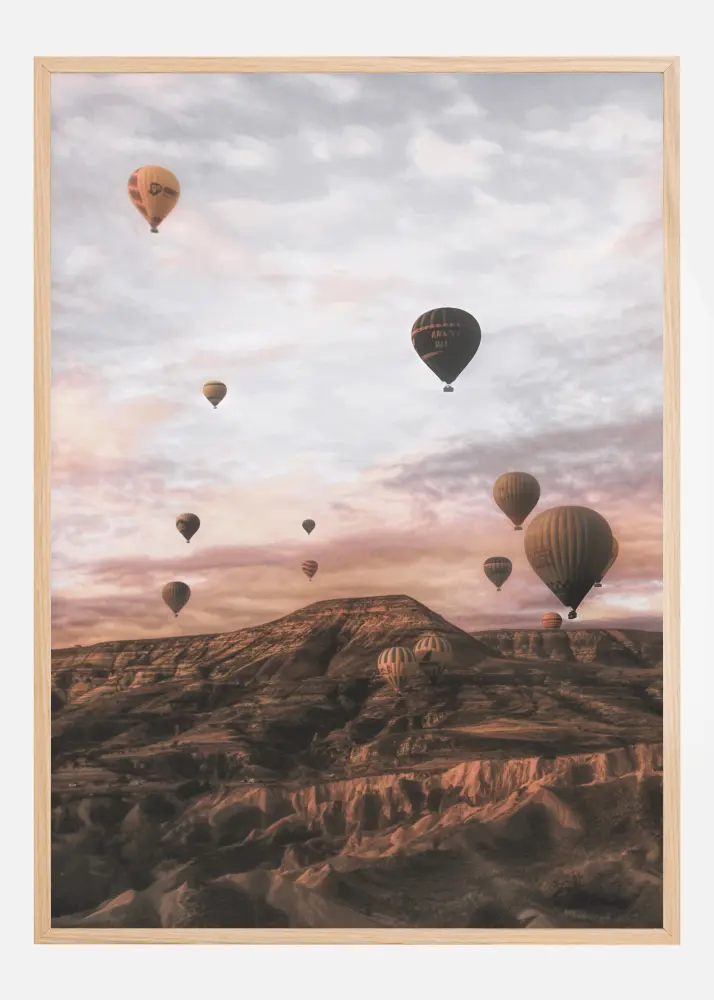 Une affiche de paysage magique de Cappadoce avec des montgolfières volant au-dessus de vos têtes. Des rochers d'un rose tendre sont éclairés par un soleil invisible qui donne également une lueur rosée au ciel nuageux. Les montgolfières flottent vers le haut. Obtenez un sentiment d'euphorie en l'accrochant chez vous.
