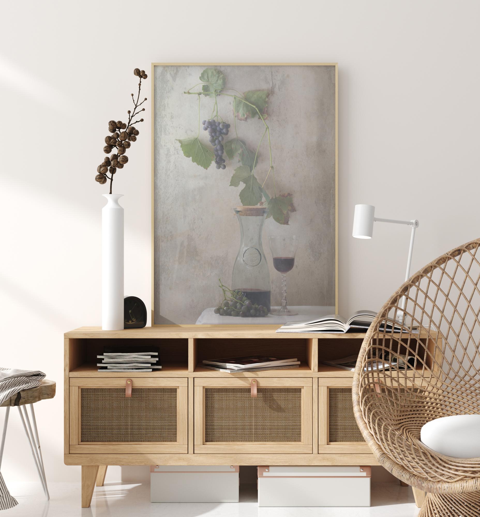 Affiche d'une nature morte représentant une carafe de vin, un verre à pied et une petite vigne. Les raisins violet foncé et les feuilles vertes sont placés sur un simple mur gris qui les fait ressortir. Transportez-vous dans une villa romaine en ramenant chez vous cette pièce simple et élégante.