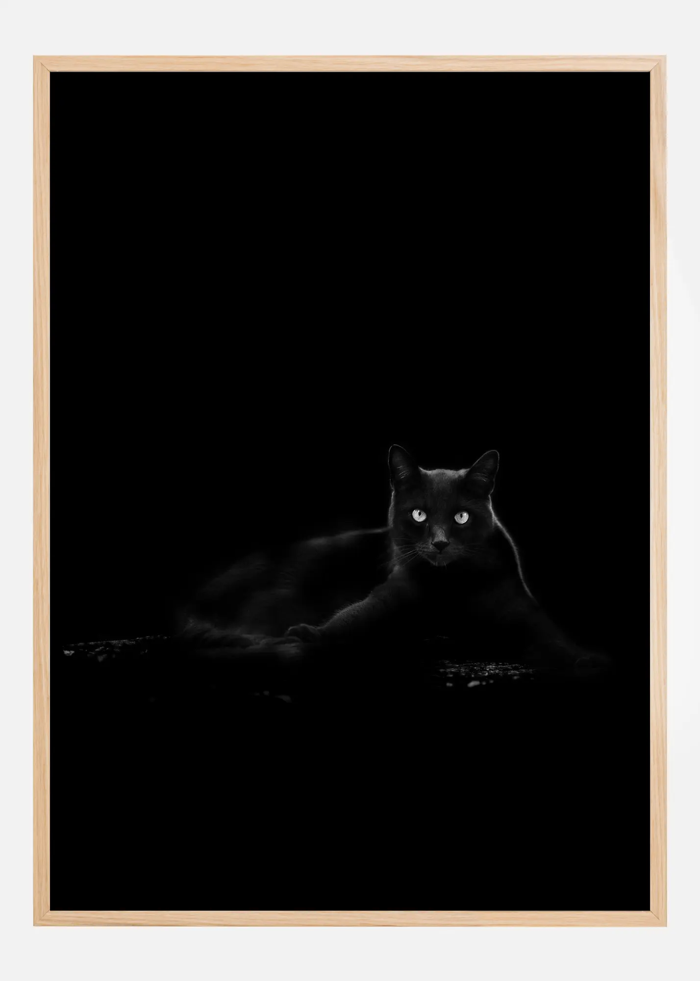 Une affiche représentant un chat noir foncé sur un fond noir. Cette impression mystérieuse nécessite un second regard car le chat noir se fond dans le fond. Seuls ses yeux et un éclairage subtil sur la fourrure permettent au chat d'apparaître dans cette image. Un effet considérable assuré si vous ajoutez cette image à un couloir sombre.