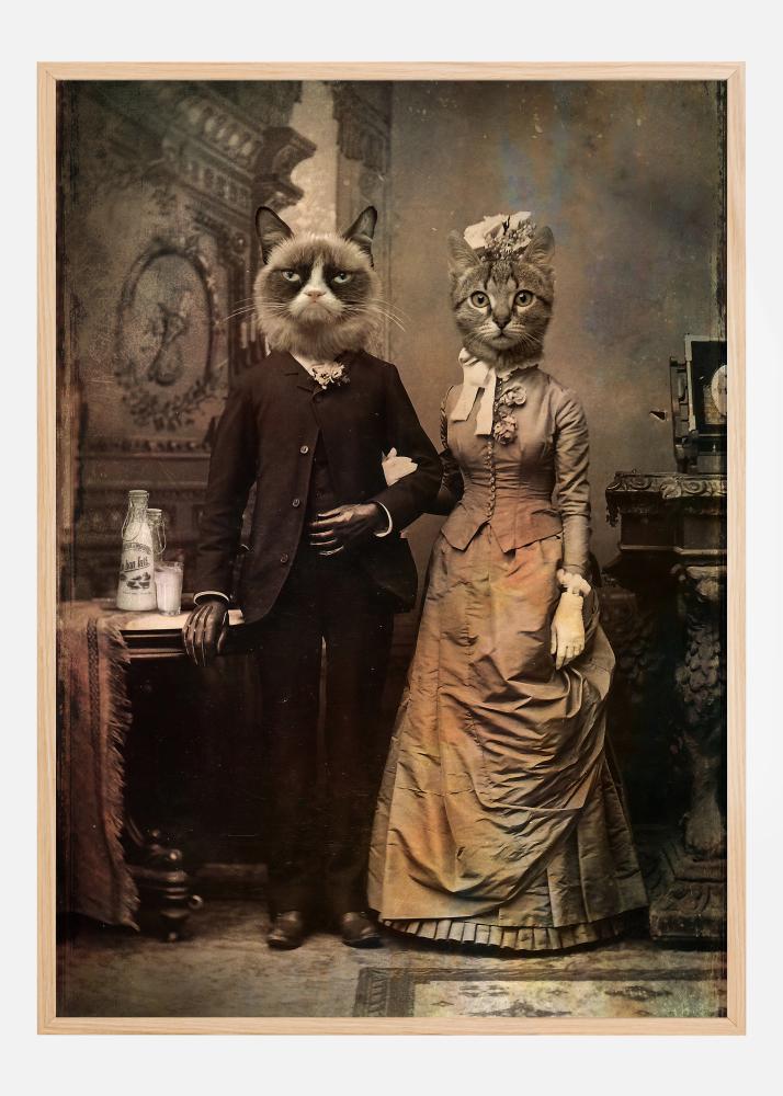 Une affiche comique mettant en scène un couple de chats habillés à la mode de l'époque victorienne. Sur cette affiche sépia, le chat grincheux et son épouse sont en tenue victorienne, avec costume et corset. Apportez un peu d'humour dans votre maison en ajoutant cette affiche au mur de votre salon.