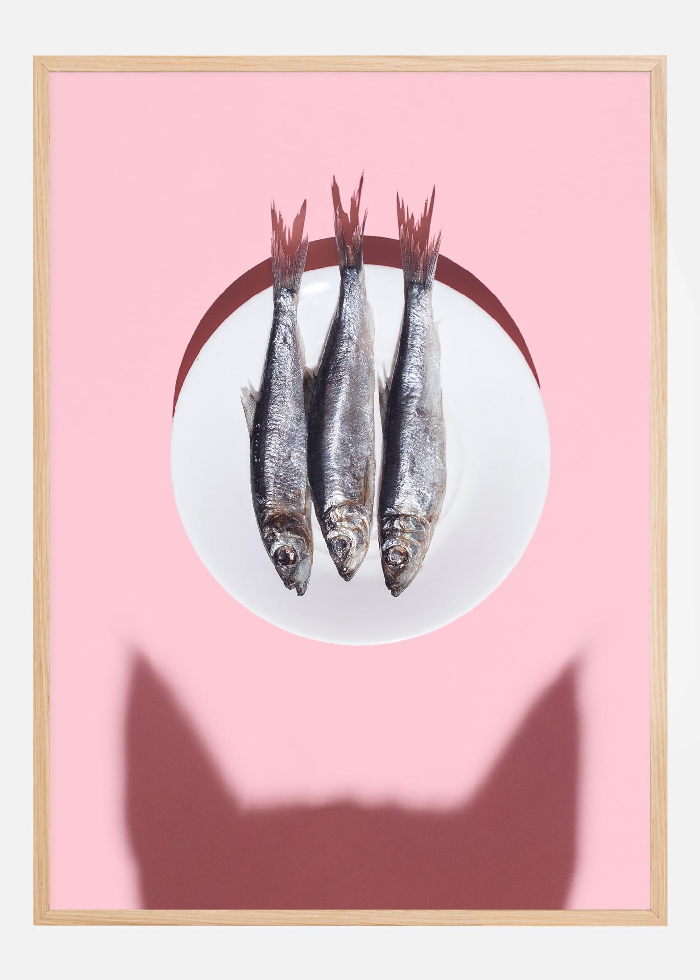 Les couleurs dominantes de cette impression sont un fond rose pastel qui s'harmonise avec le blanc de l'assiette et le gris argenté des poissons, renforçant la texture et la forme des éléments visuels. Le jeu de lumière entre les objets et le fond capte l'attention du spectateur et contribue à une sensation dynamique dans l'image. Cette affiche n'est pas seulement une œuvre d'art pour les amateurs de gastronomie et les passionnés de chats, mais aussi pour ceux qui apprécient la beauté de la simplicité et une subtile touche d'humour dans le design d'intérieur.