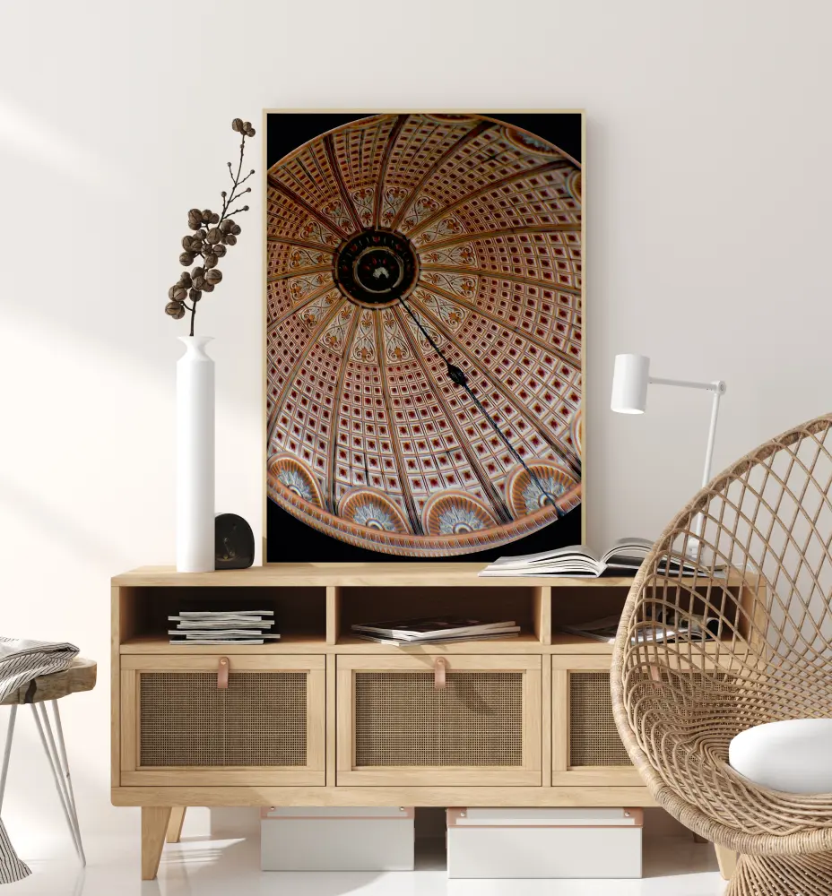 Une affiche d'architecture d'intérieur d'un plafond au design époustouflant. Levez les yeux vers ce dôme rouge et or pour un effet presque vertigineux. Tracez les cercles et les lignes de ce plafond aux motifs complexes et admirez l'habileté dont il fait preuve. Ajoutez cette image à un mur ordinaire pour plus de détails.