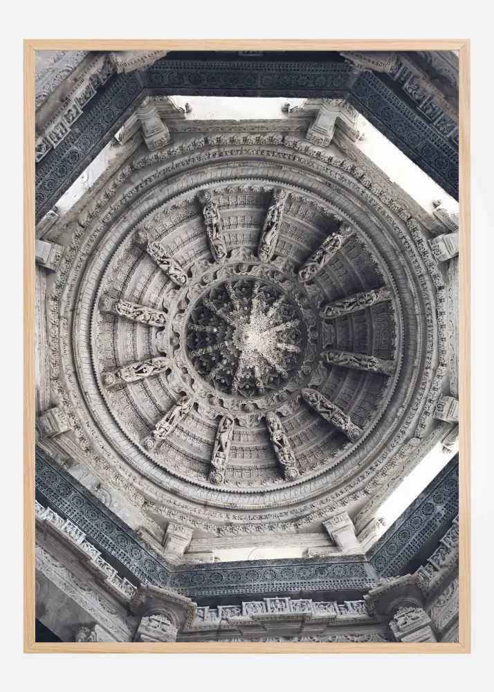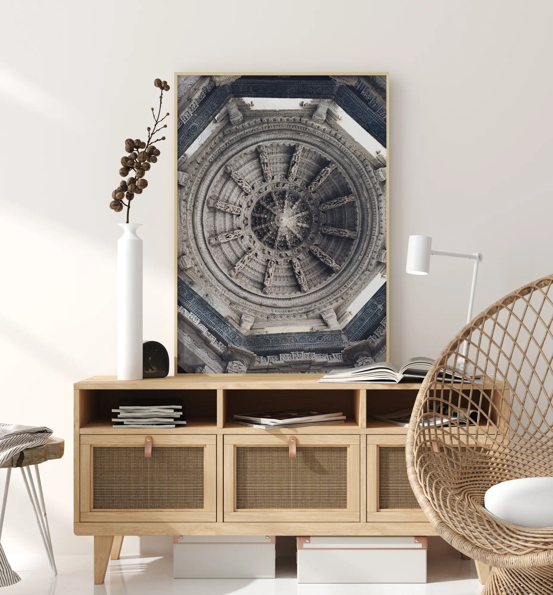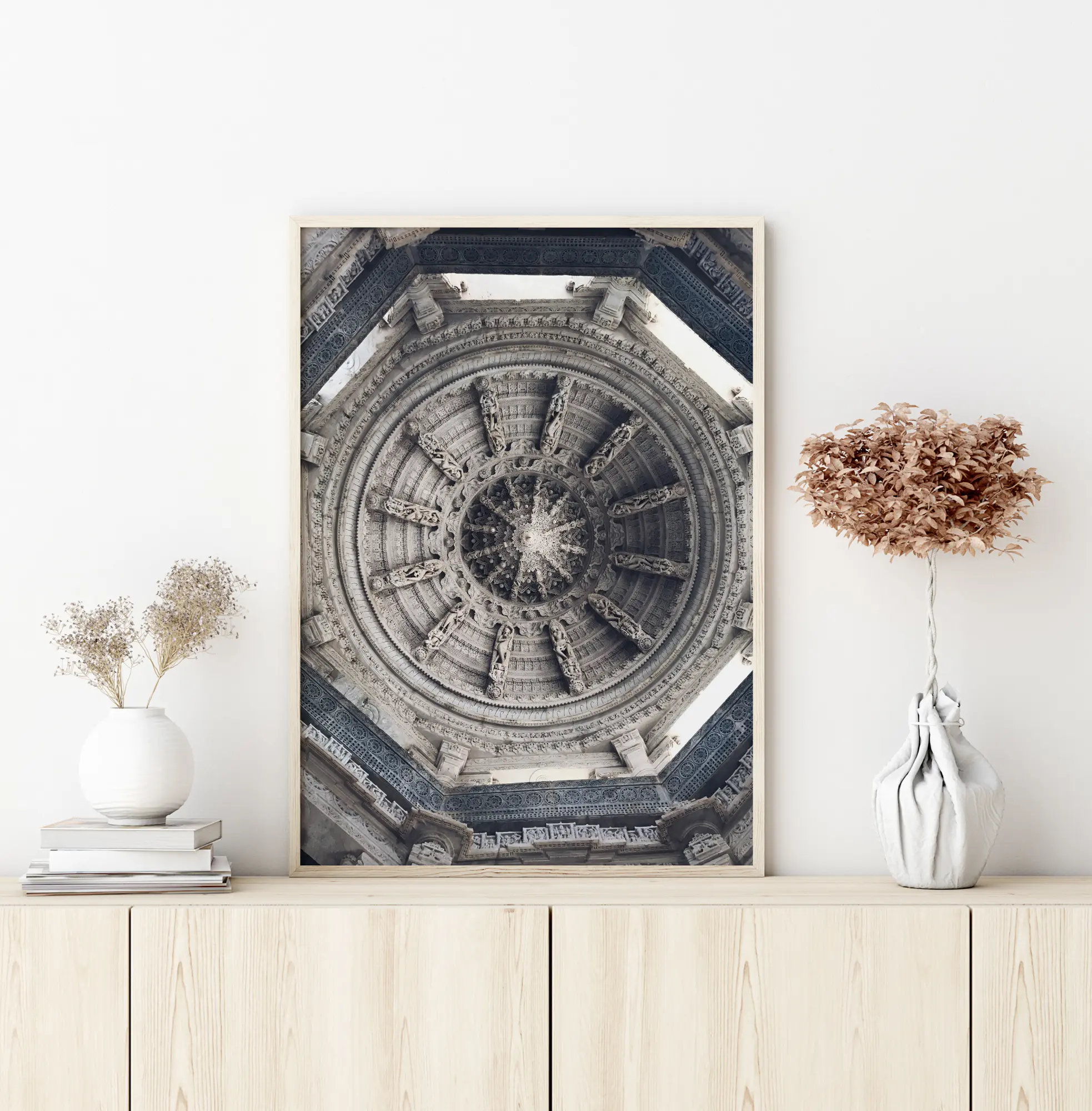 Une affiche en noir et blanc d'un plafond gris pierre. Le plafond est conçu à l'aide de cercles et ressemble à une roue de bateau. Entouré d'un octogone, il présente des formes géométriques partout. Redonnez vie à un mur bleu tendre en y ajoutant ce poster.