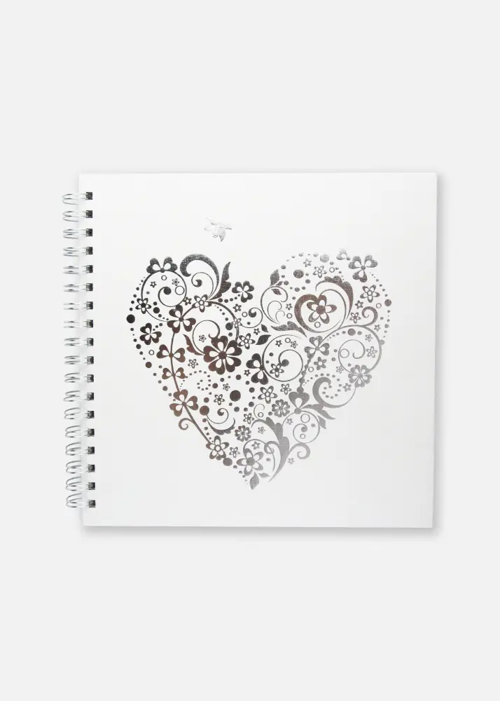 Joli album à reliure à spirales en blanc au format 18x18 cm. Sur la face avant, il y a un cœur argenté imprimé de ravissants détails floraux. L'album contient 24 feuilles sans acide en blanc, et c'est un album parfait à laisser sorti pour le feuilleter, et ce sans prendre trop de place.
