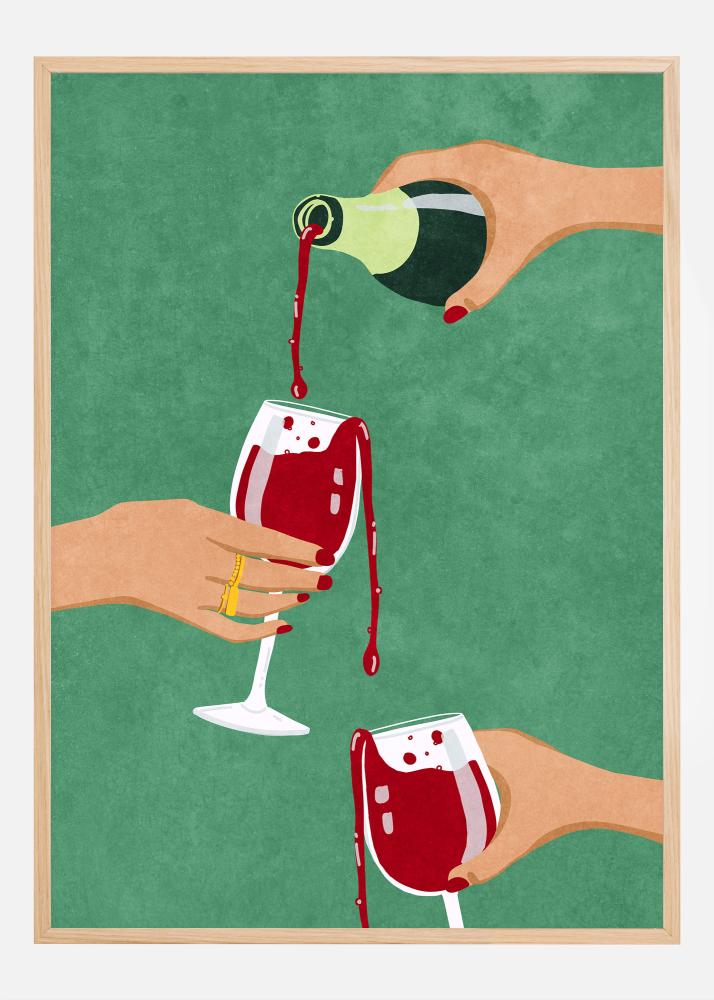 Cette affiche ludique et sophistiquée capture l'essence de l'amitié et de la célébration. L'illustration montre trois mains tenant élégamment des verres à vin et une bouteille, avec un flot de vin rouge qui vient d'être versé dans l'un des verres. Cette scène est un hommage aux petits moments qui rendent la vie spéciale, et est un choix idéal pour ceux qui souhaitent ajouter une touche de convivialité et de festivité à leur maison. L'impression est autant un sujet de conversation qu'un élément de décoration intérieure.