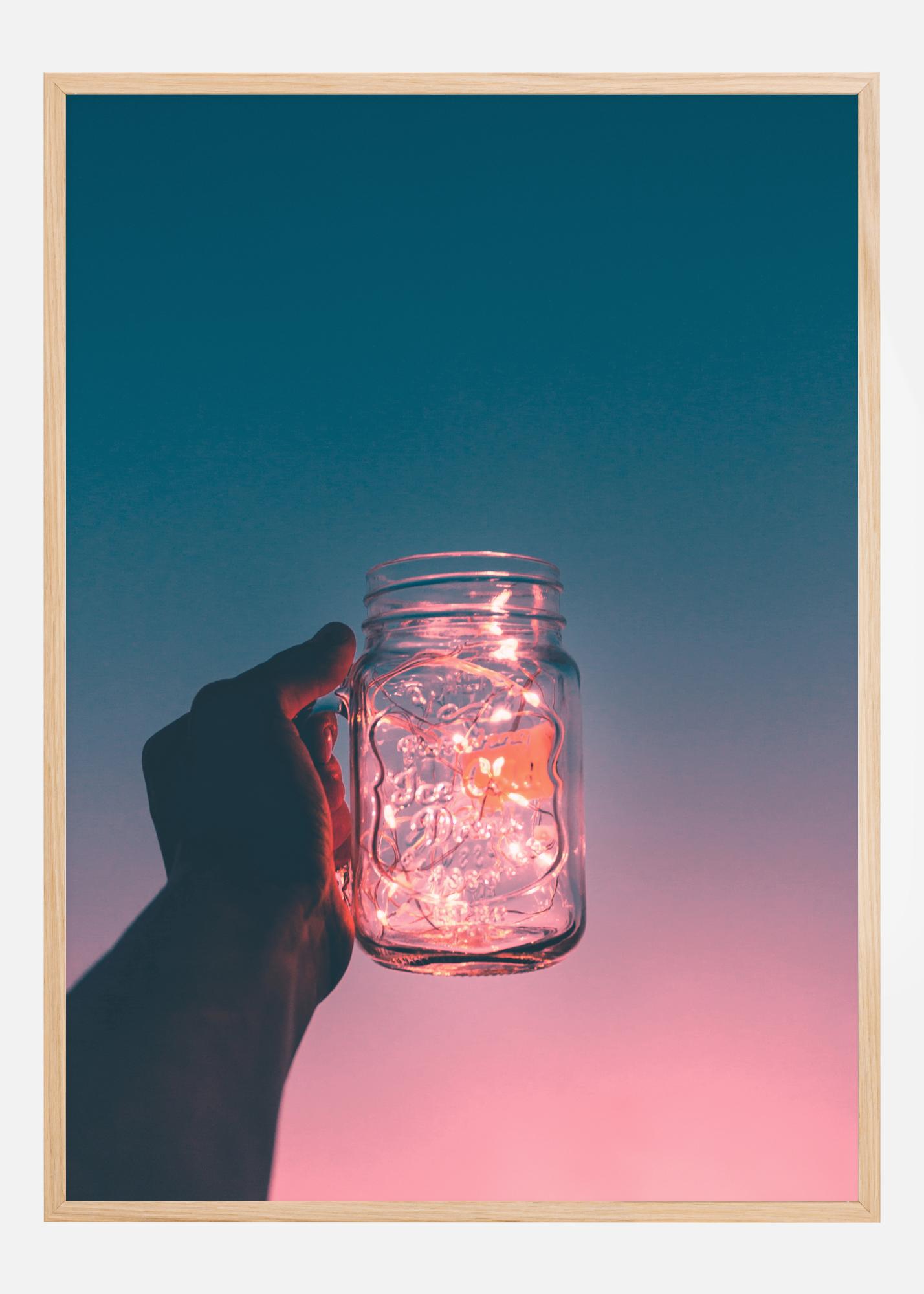 Une d’une main tenant une tasse en forme de pot avec des lumières de fée à l'intérieur. Appréciez cette ambiance magique et les lumières brillantes qui se détachent sur un fond bleu et rose doux, ce qui lui confère un aspect fantastique. Trinquez à cette image et sentez la légèreté que cette affiche apporte.