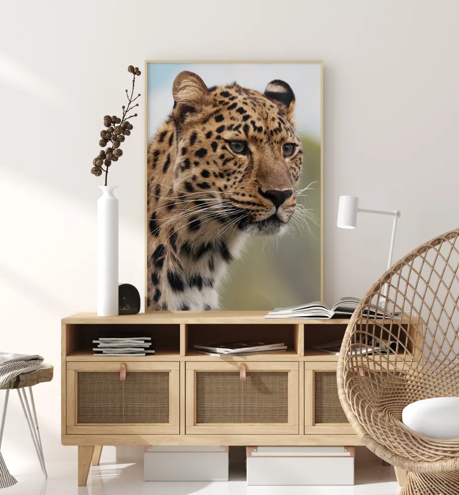Une affiche animalière représentant un léopard en gros plan. Les détails du léopard font ressortir les taches, les moustaches et les couleurs des yeux. En regardant l'image, vous vous demandez ce que l’animal regarde. Cette affiche procure un sentiment de nature épique.