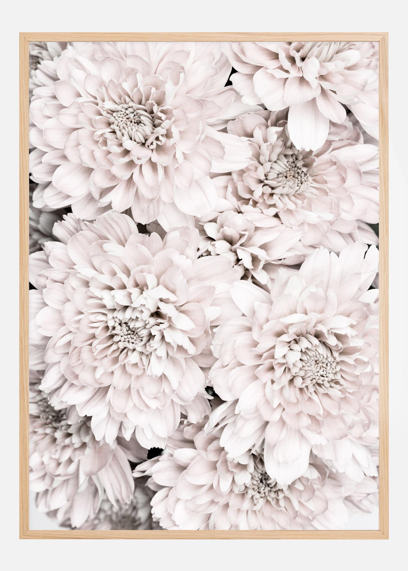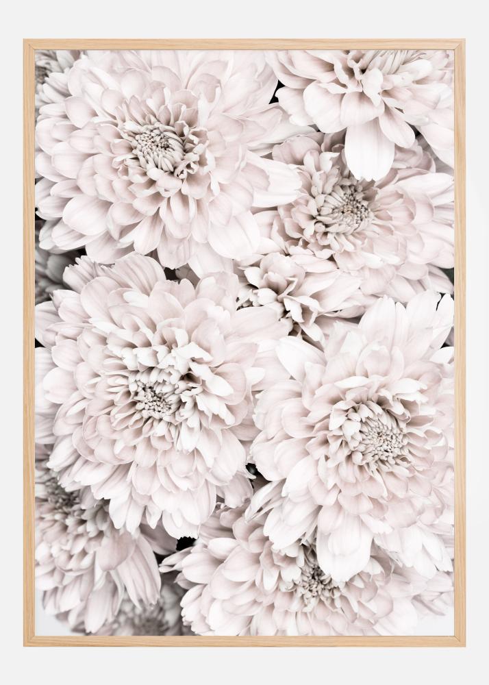 Une affiche élégante présentant une collection de différents chrysanthèmes. Quatre grandes fleurs de chrysanthème remplissent cette image, délicates et remplies de minuscules pétales. Associez les tons rose tendre et blanc à un mur neutre de votre chambre pour un réveil magique.