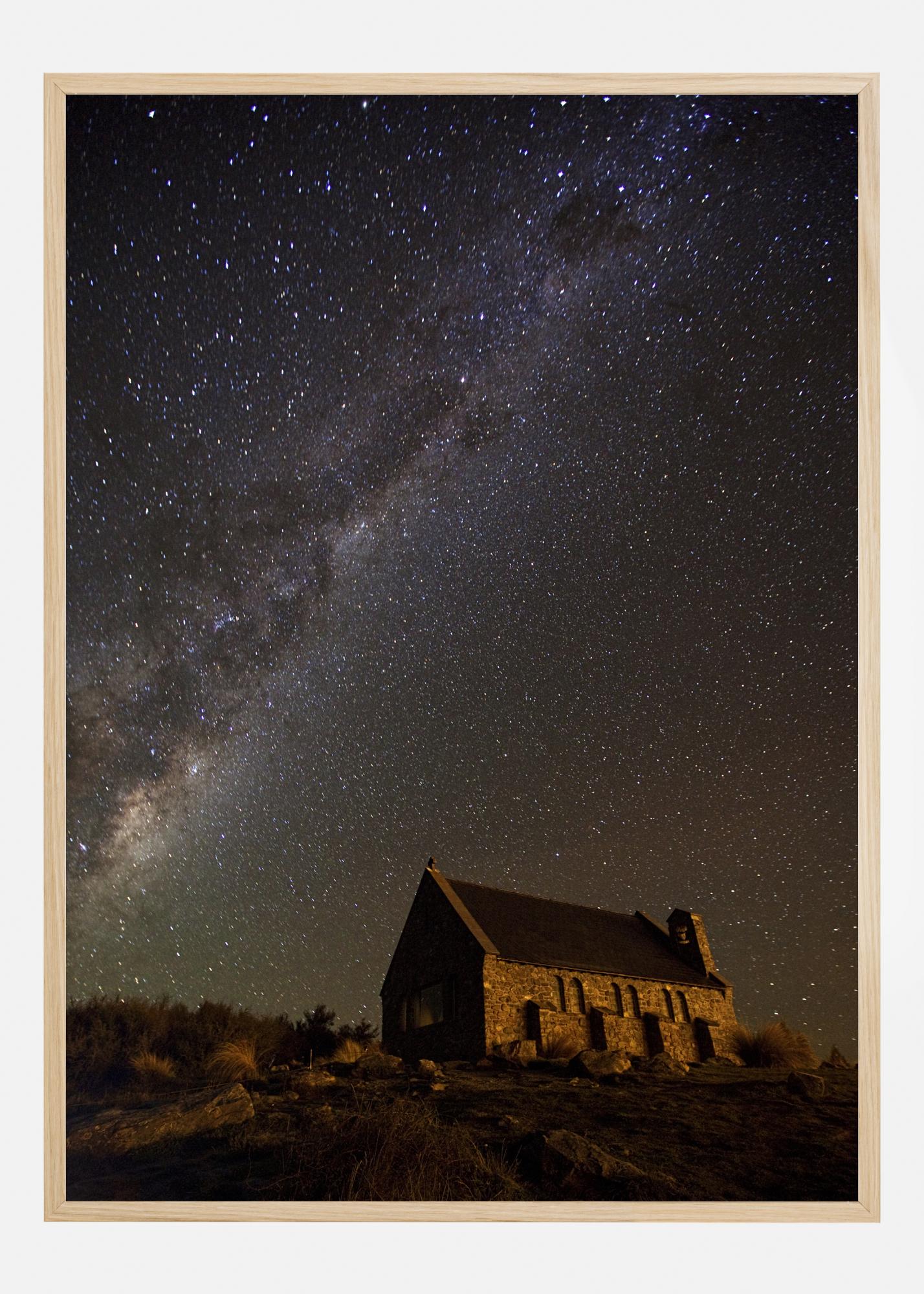 Affiche religieuse d'une vieille église en pierre avec la Voie lactée en toile de fond. L'église rustique est éclairée par une douce lumière orange au sommet d'une douce colline. Le ciel nocturne lumineux est rempli de petites étoiles en têtes d'épingles alors que la galaxie s'enroule en spirale au-dessus du bâtiment. Ressentez la beauté de notre univers dans cette image.