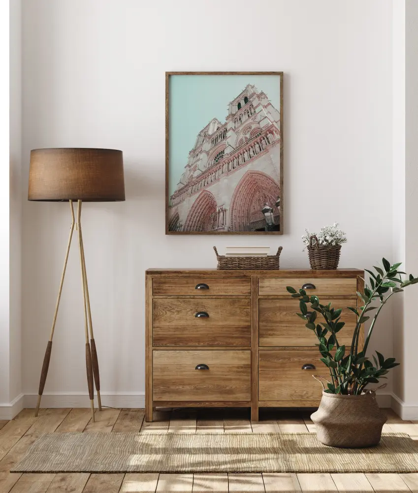 Une affiche spectaculaire de la façade d'une église. Admirez ce bâtiment blanc et rose avec ses arcs gothiques, ses statues de saint en pierre et ses fenêtres rondes. Les doux pastels créent un sentiment d'harmonie, le moyen idéal de s’offrir une ambiance apaisante chez soi.